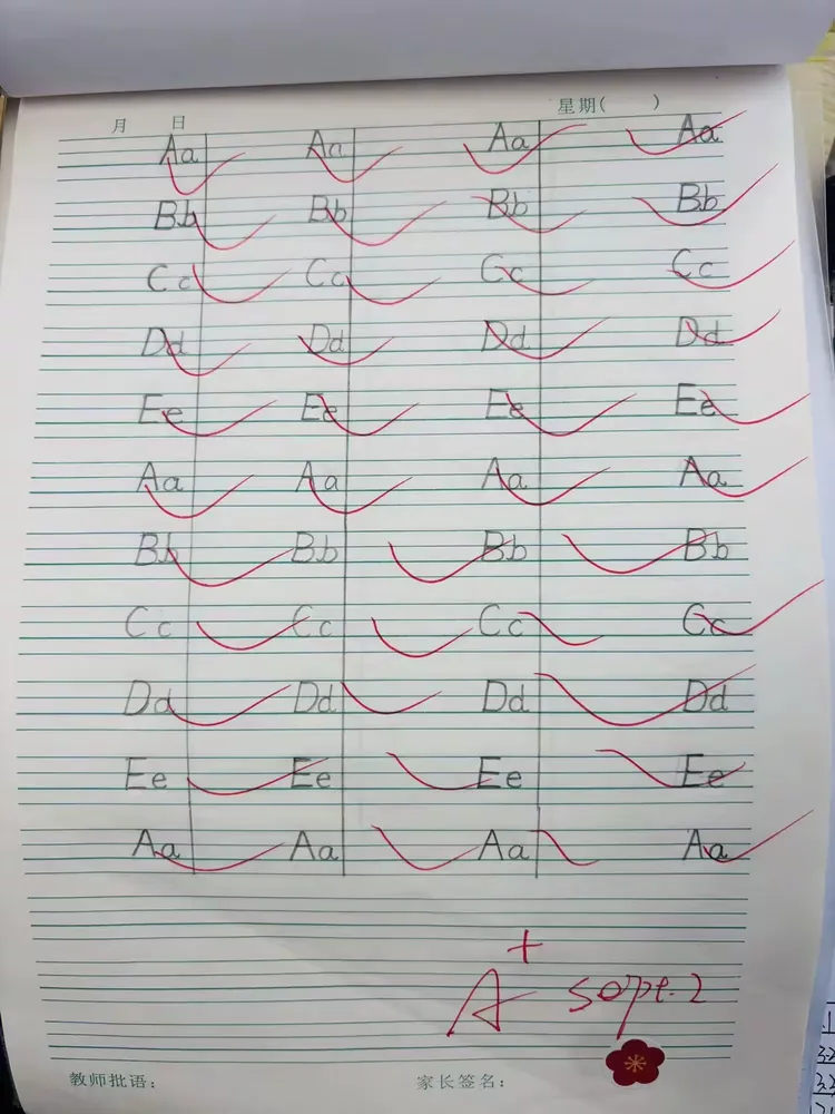 英语学科作业批改工作既严守常规标准,又充满小学阶段特有的教育温度。通过单词、短语、对话等书写练习,鼓励学生在读写中培养语感,提升英语综合实践能力。