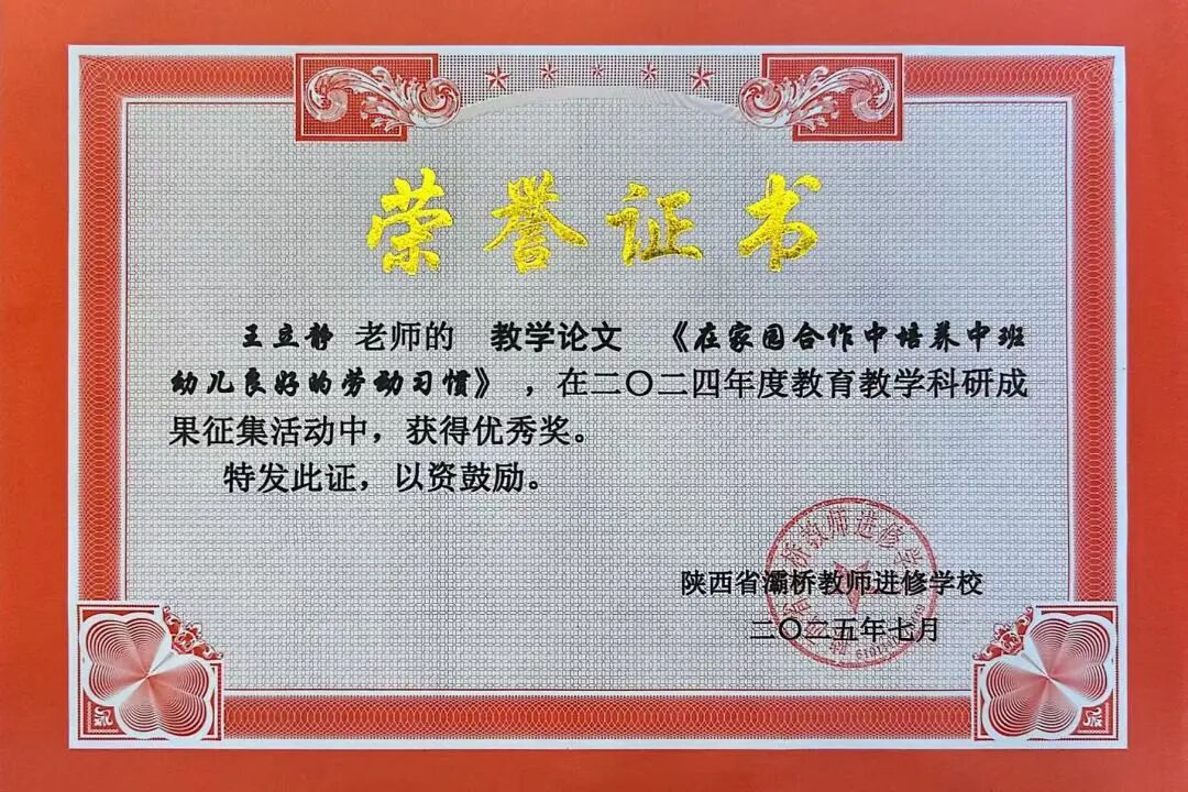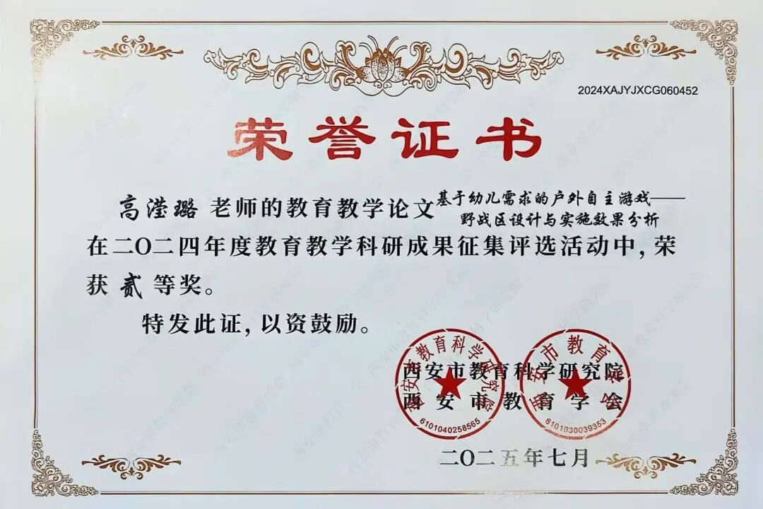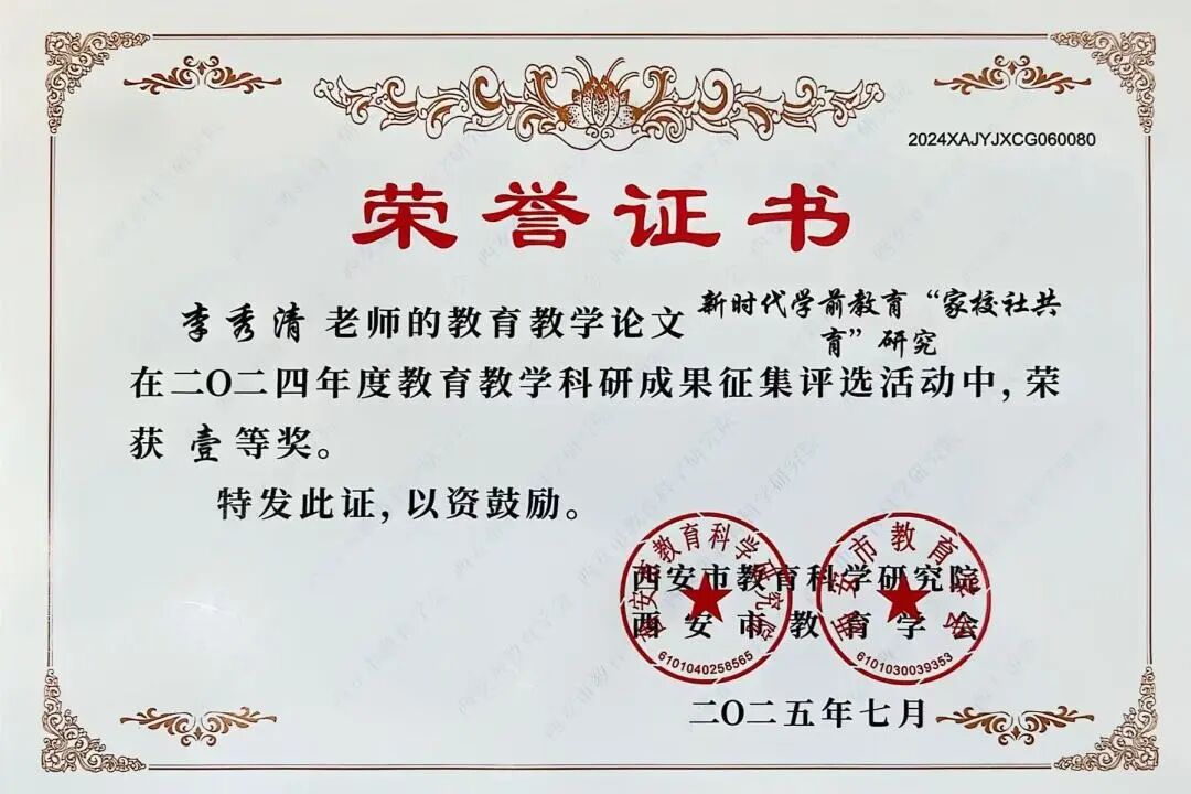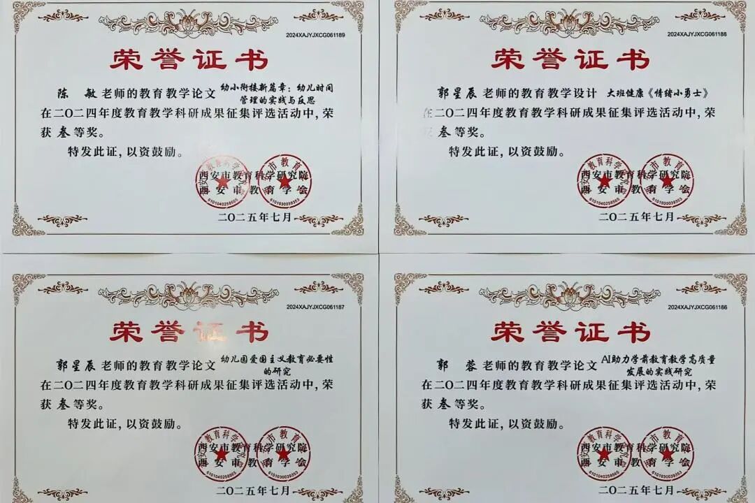 近日,由西安市教育学会联合主办的 “2024 年度教育教学成果评选活动” 结果正式揭晓。在这场汇聚全市教育智慧的评选中,西安市灞桥区席王街道中心幼儿园教师凭借深厚扎实的理论根基、严谨细致的实践研究,交出了一份亮眼的答卷 ——共计 23 人次在西安市教育科学研究论文评选中获奖,用实力彰显了我园教师队伍的专业素养与教研实力!
