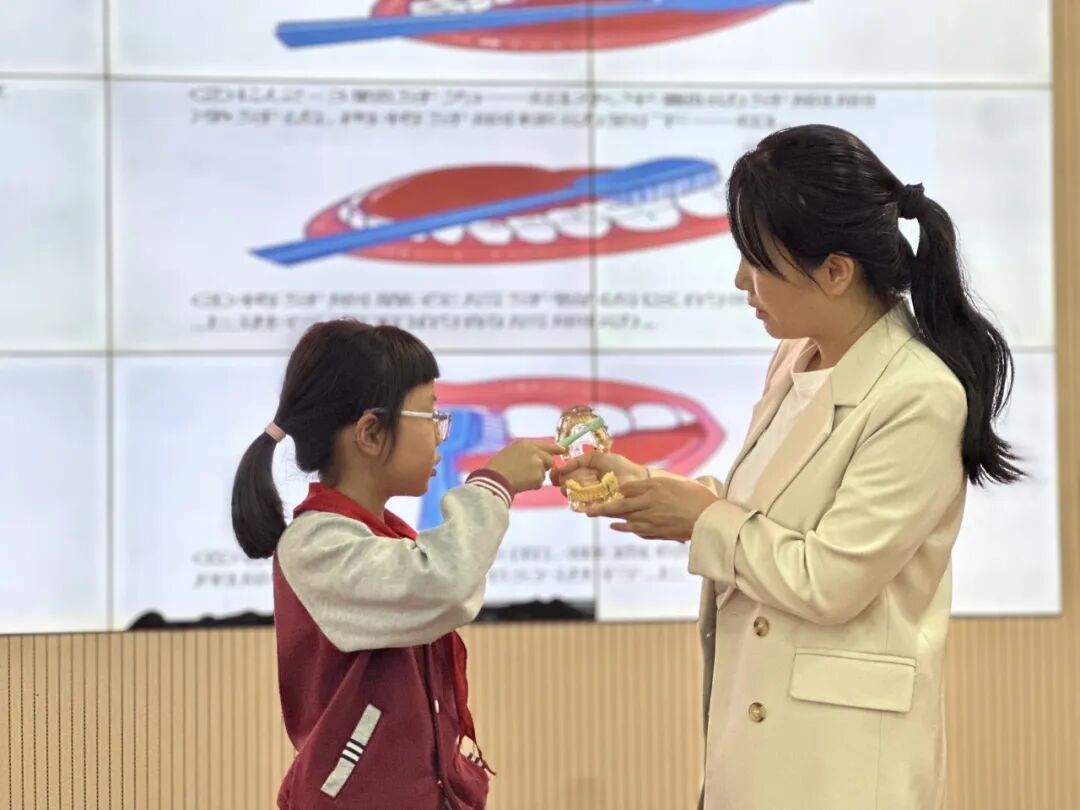 讲座现场,医护人员巧思频发:用“萌芽时光机”串联牙齿生长的奇妙历程,以“窝沟迷宫”具象化牙面藏污纳垢的隐患,再借“超能装甲”比喻窝沟封闭的防护作用等一个个生动意象,让原本抽象的护牙知识瞬间鲜活起来,稳稳锁住了孩子们的目光与好奇心。互动环节中,孩子们踊跃举手发言。除此之外医护团队还带来了牙齿模型现场和同学们一起演示正确刷牙的步骤。