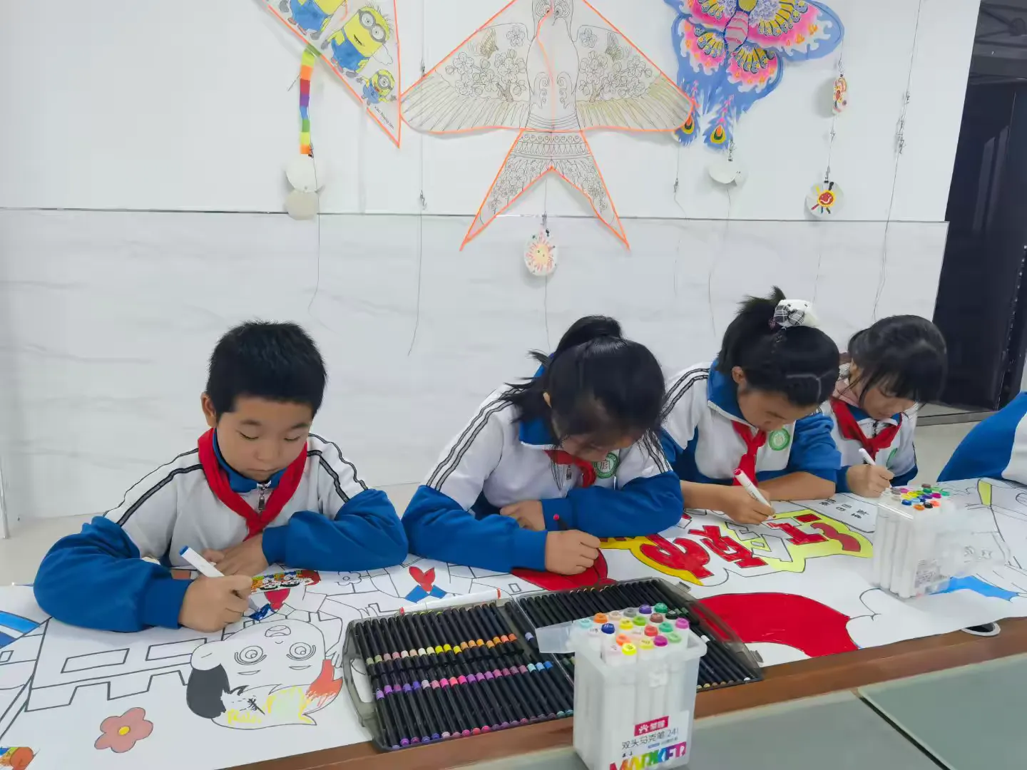 活动现场,洁白的画布缓缓铺开,同学们默契配合、团结协作,手握画笔尽情描绘祖国的壮丽河山、璀璨历史文化与对未来的美好憧憬。每一笔色彩、每一划线条,都饱含着孩子们对祖国母亲最深厚的眷恋与深情。