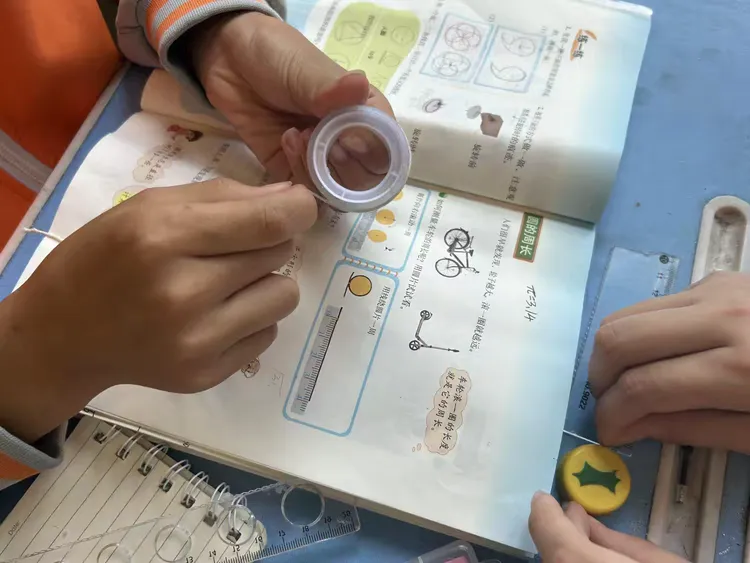活动伊始,青年教师胡洁老师带来《圆的周长》示范课。课堂上,她打破传统教学模式,从学生熟悉的“自行车轮为什么是圆形”切入,引导学生通过实践操作,自主发现圆的圆心、半径、直径等关键特征。
