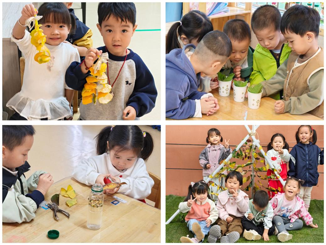 动手实践环节涵盖“树叶观察瓶”“晒秋(橘皮)”“树叶帐篷搭建”“踩树叶音乐会”“会‘喝水’的秋叶”实验等活动。孩子们在记录树叶褪色、见证橘皮变干中感知形态与气味的改变,在搭建帐篷、聆听叶响、探索叶片吸水原理中,既体验了秋日的趣味,又悄然播下科学探索的种子。