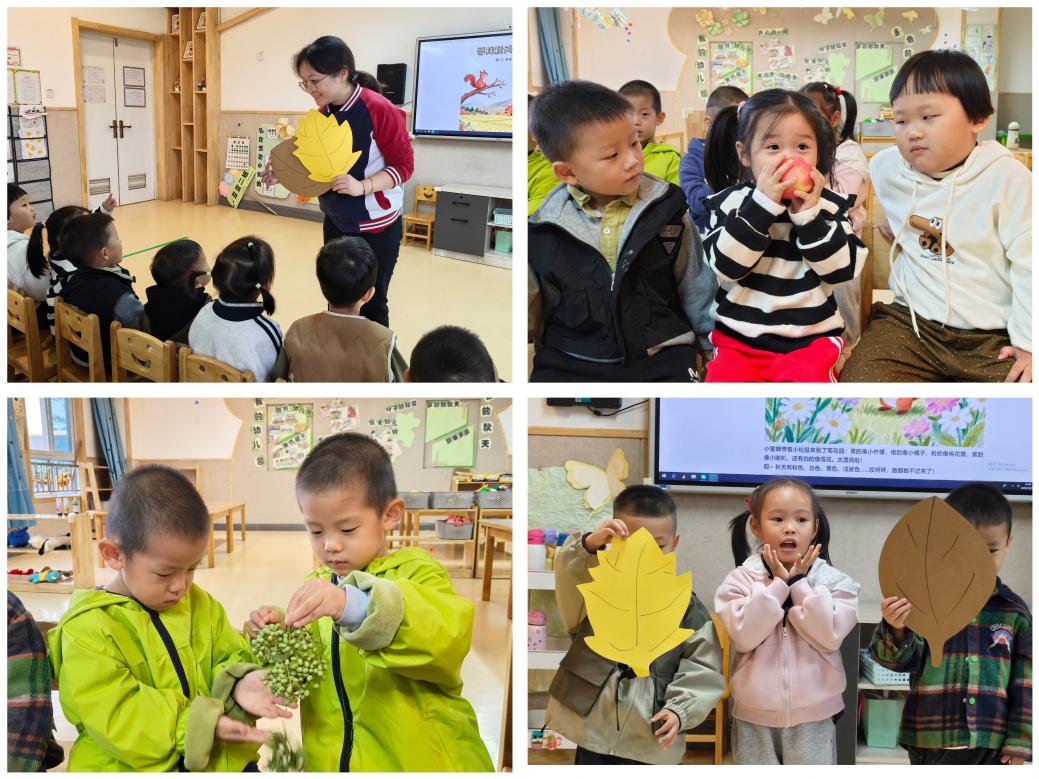 绘本浸润环节同样精彩。“小动物为什么要囤粮食呀?”“树叶为什么会飘下来?”围绕孩子们的疑问,老师结合《寻找秋天》等绘本,用生动语言与趣味画面,引导幼儿了解秋天里动植物的变化。孩子们跟着故事情节展开想象,在倾听与讨论中进一步丰富对秋天的认知。