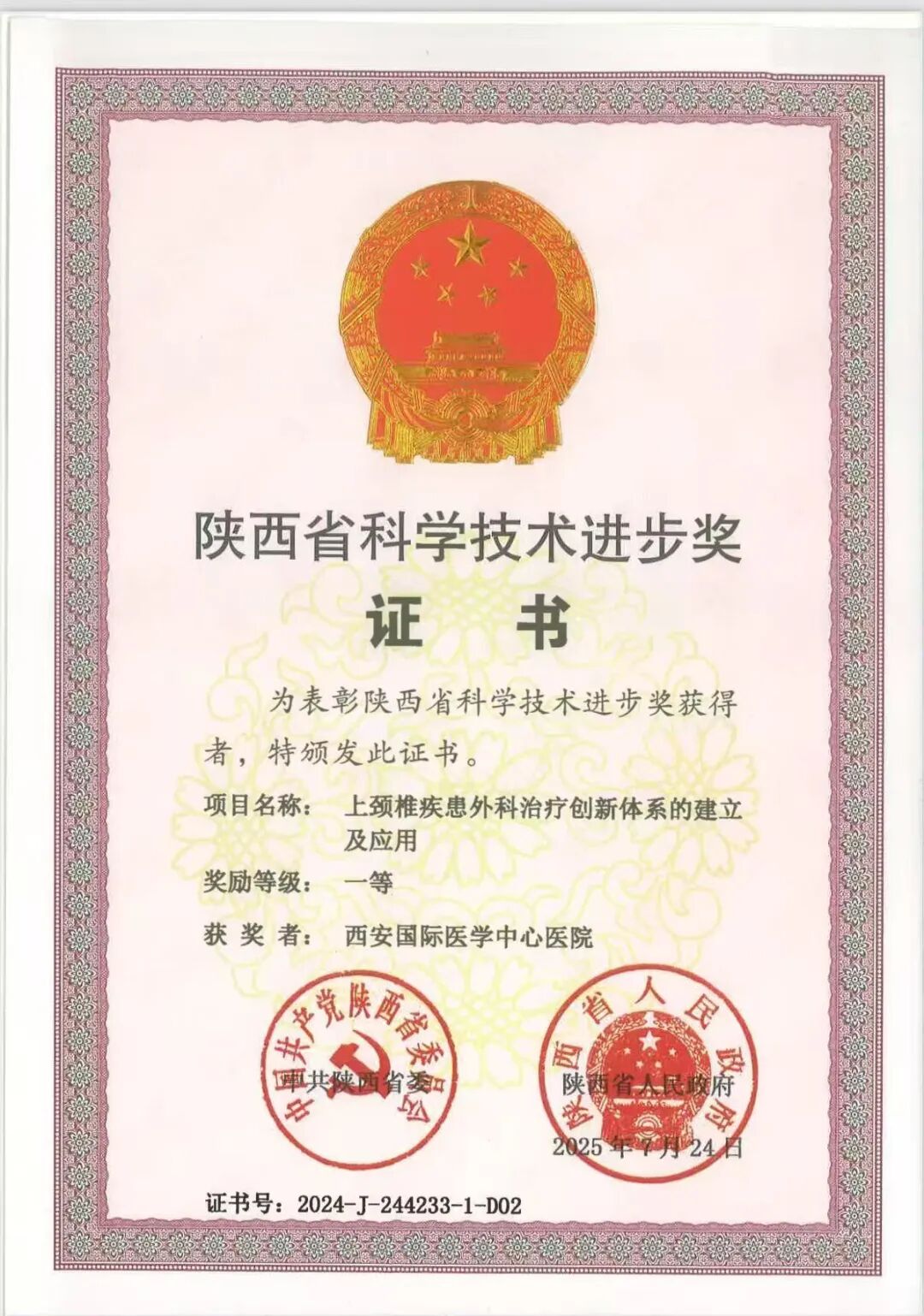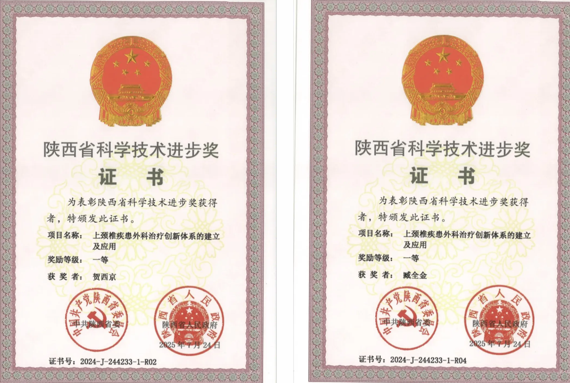 陕西省科学技术进步奖作为陕西省科技界的最高荣誉,评审标准极为严苛,是技术“含金量”的重要标定。此次西安国际医学中心医院获此殊荣,是对该院科研创新实力的权威认证,标志着医院在上颈椎外科这一高精尖领域,已建立起显著的技术优势,占据行业引领地位。贺西京总院长、脊柱外科臧全金主任为该奖项主要完成人。