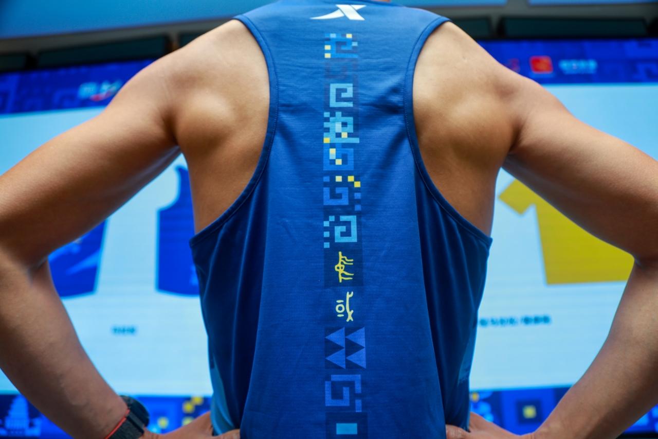 服装背面以“文明脊柱,奔涌脉动”为设计蓝本,将宝鸡青铜器文化中的古老符号与现代运动美学巧妙结合。抽象化的凤鸟纹饰与云雷纹几何变体,共同打造出一条贯穿上下、富有节奏感的视觉脊线。尤为引人注目的是,背面嵌入了何尊铭文“中国”二字,采用深蓝底色与金色笔触的搭配,完美呈现出青铜铭文的古朴质感。从何尊铭刻“中国”的礼乐文明,到逨盘记载的周王功绩,宝鸡承载着周人“德治天下、崇文尚礼”的文化基因,而这一设计正将“永不放弃、顽强拼搏”的马拉松精神与周风秦韵、赳赳老秦精神深度交融,让选手在奔跑中感受历史与运动的碰撞。
