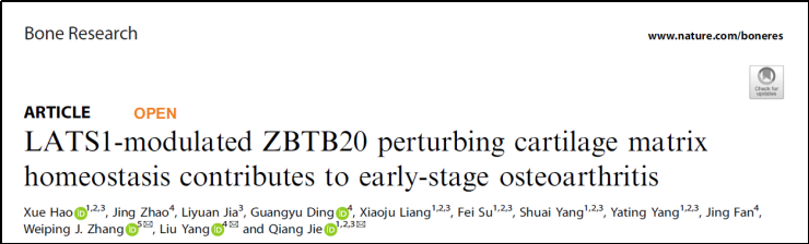 骨关节炎(OA)是最常见的骨关节退行性疾病之一,伴随社会发展累及人群呈倍数增长,给社会经济带来重大负担。团队从发育视角明晰“OA早期炎症信号的激活与活性调控机制”,旨在为临床建立“早期诊断、早期干预、精准介入”的OA诊疗方案提供新的见解。相关内容以“LATS1-modulated ZBTB20 perturbing cartilage matrix homeostasis contributes to early-stage osteoarthritis”为题,于2025年3月发表于Bone Research杂志(中科院一区TOP期刊,影响因子15)。