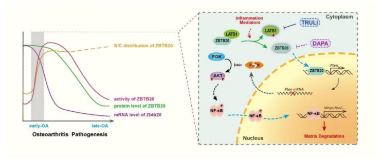 该研究对OA早期软骨基质退变的分子机制进行探究,发现软骨细胞内转录因子ZBTB20活性受LATS1调控,早期软骨细胞内ZBTB20激活抑制Pten表达,激活NF-κB信号通路扰乱软骨细胞外基质稳态、促进疾病进展,从而明确了LATS1-ZBTB20-PTEN轴在OA发病早期的重要作用,完善OA发病早期细胞分子调控机制。同时,团队还围绕LATS1-ZBTB20进行相关靶向干预策略尝试,发现靶向LATS1磷酸化及Zbtb20表达的小分子化合物TRULI和DAPA具有延缓OA进展的作用,进一步开拓了OA临床治疗的研究新思路。
