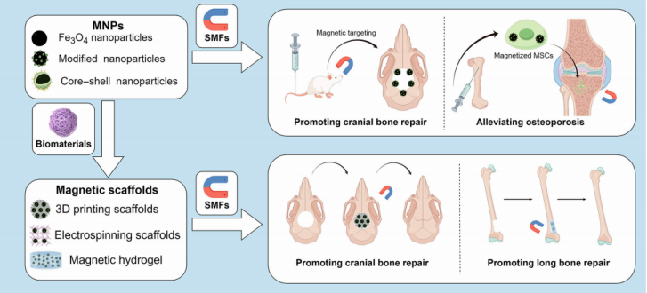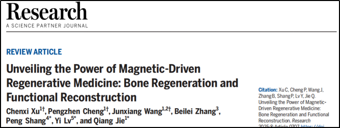 为了改善大面积骨缺损和骨质疏松症的治疗效果,研究人员长期致力于细胞命运调控、生物材料设计和理化干预来减少骨质流失或加速骨再生。磁作为一种生物物理信号,具有低毒性和无创的特点。它在自然界中无处不在,持续影响着人类健康,大量研究证实磁对包括肌骨系统在内的多器官疾病具有治疗潜力。团队回顾并系统分析了磁在骨的结构再生和功能重建中的作用及机制,2025年5月以“Unveiling the Power of Magnetic-Driven Regenerative Medicine: Bone Regeneration and Functional Reconstruction”为题发表于Research杂志(中科院一区TOP期刊,影响因子10.7)。