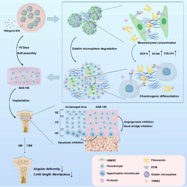 儿童骺板损伤诱发的“骨桥置换”会导致成角畸形和肢体不等长等严重并发症。目前临床上常用的治疗手段为骨桥切除术联合惰性材料填充,该疗法旨在预防骨桥形成,无法再生骺板软骨。近年来,受天然发育机制启发的发育工程策略应运而生,通过模拟发育过程中的关键事件以实现器官的功能化替代。在骨骼发育过程中,间充质凝聚是其始动因素,IHH(Indian hedgehog)信号是骺板有序结构的调控因素,体外模拟这两项关键机制可能是构建仿生骺板的可行路径之一。2025年8月,研究成果以“Biomimetic epiphysis inspired by natural developmental mechanisms promote the repair of large-scale epiphyseal defect”为题发表于Biomaterials杂志(中科院一区TOP期刊,影响因子12.9)。