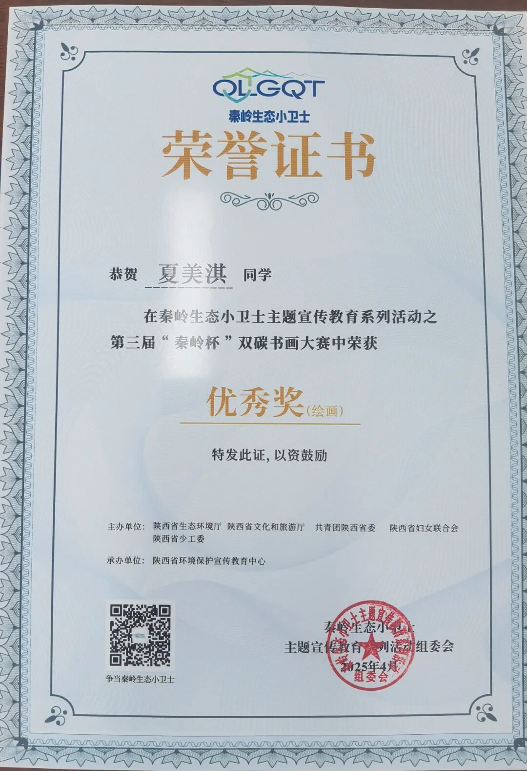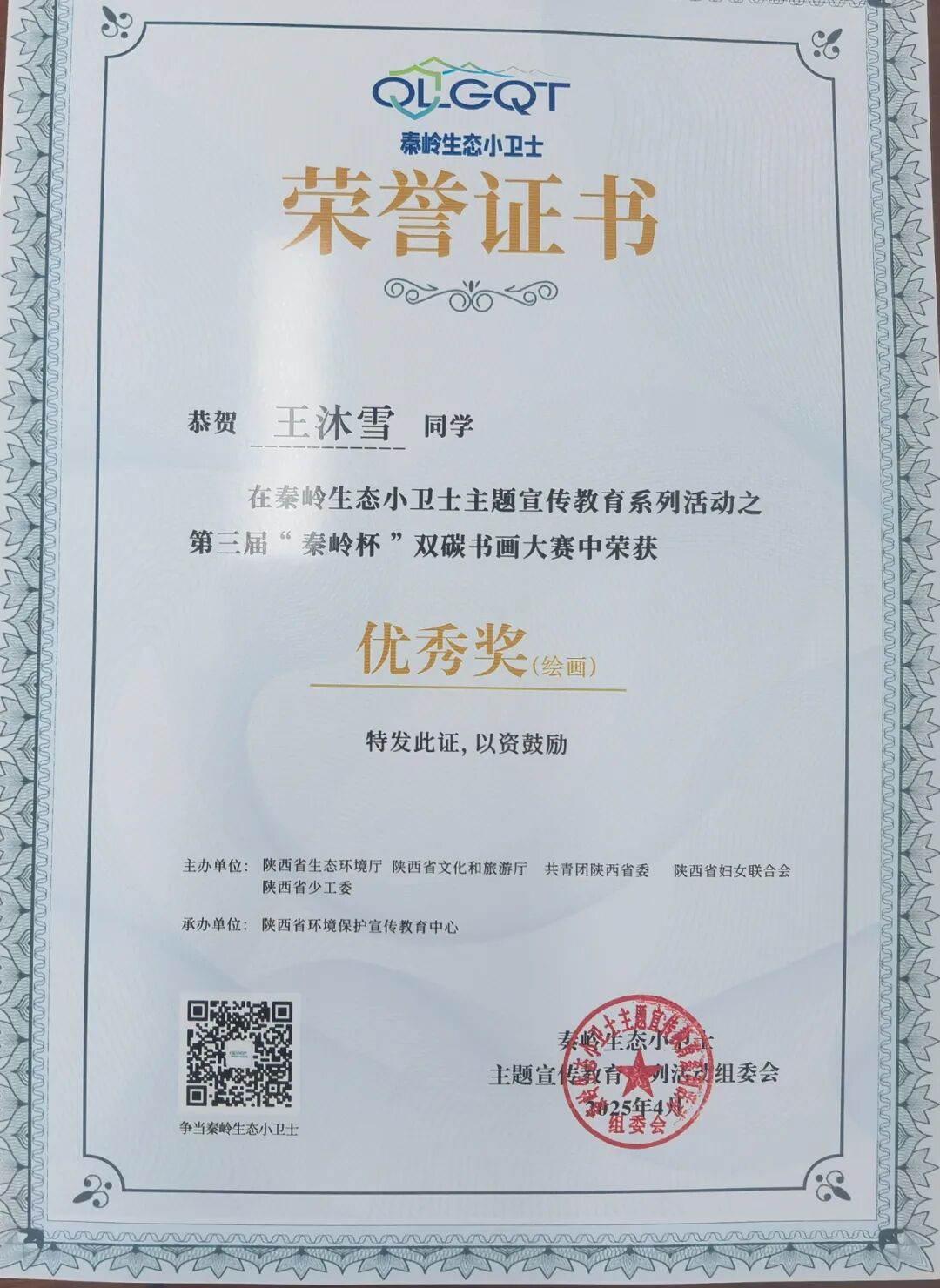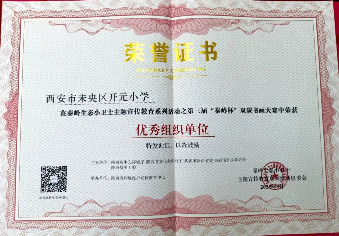 近日,在陕西省生态环境厅、陕西省文化和旅游厅、共青团陕西省委、陕西省妇女联合会、陕西省少工委等联合主办的秦岭生态小卫士主题宣传教育系列活动之第三届“秦岭杯”双碳书画大赛中,西安市未央区开元小学荣获多个奖项。
