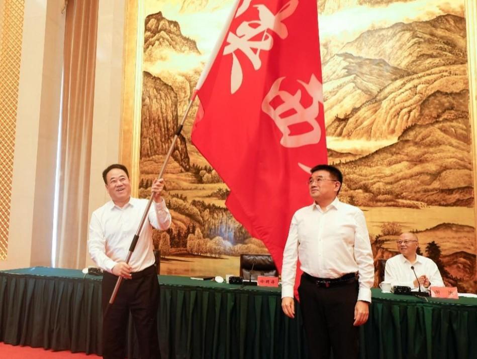 2025年9月29日,陕西省副省长徐明非(右)向陕西省体育局党组书记、局长尤磊授予第十五届全运会陕西体育代表团团旗。