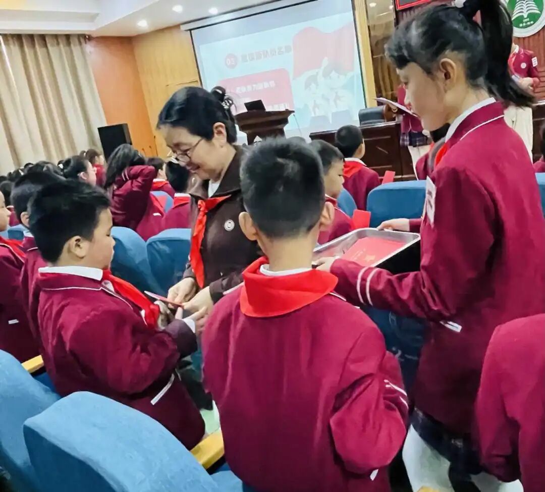 当主持人庄重地宣读完2024级第二批新队员名单后,老队员们手捧鲜艳的红领巾,迈着整齐的步伐走到新队员面前,细心地为他们系上红领巾。当象征光荣与责任的红领巾在新队员胸前飘扬时,新老队员互敬队礼,快门声定格下这一充满意义的瞬间。紧接着,四位中队辅导员为新队员颁发少先队员证,接过证书的那一刻,新队员们的脸上满是自豪与喜悦。