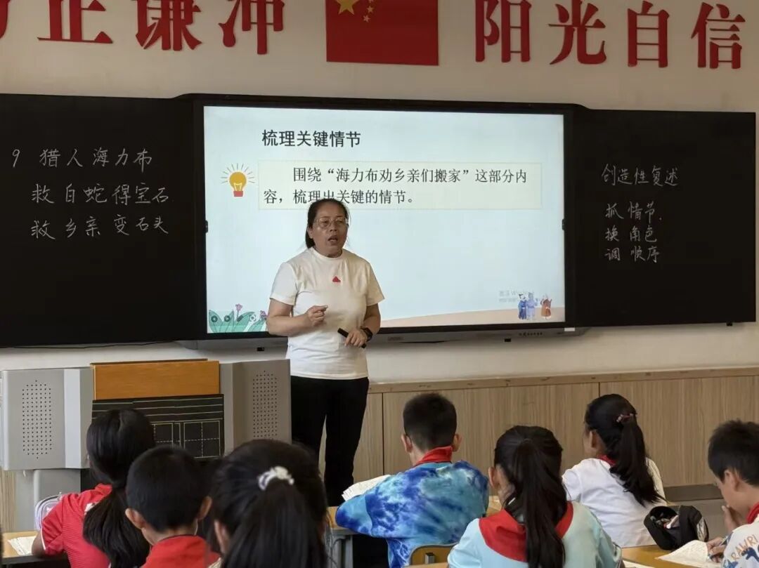 宋建利老师讲授《猎人海力布》第二课时,聚焦 "创造性复述故事" 语文要素。先复习复述方法,过渡到创造性复述,指导学生掌握三个方法:抓住主要环节、变换角色、调换写作顺序。学生实践后,老师及时点评引导。最后,引导学生为 "海力布" 石头写来历介绍,教学效果良好。