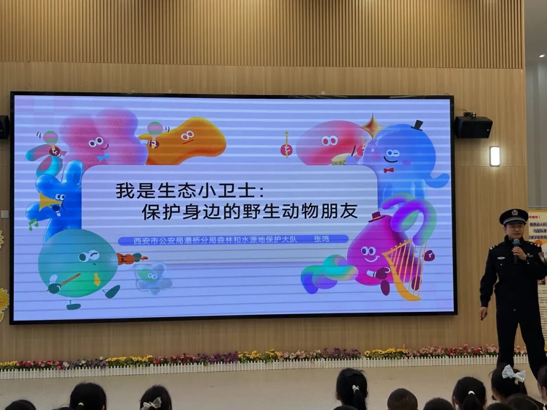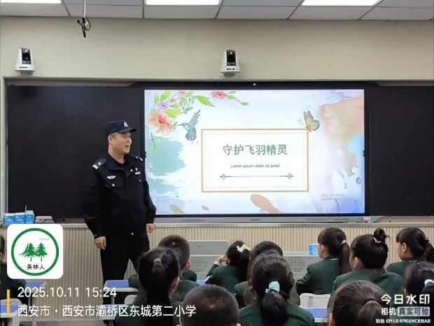同日,林水大队还联合灞桥区林业局,共同走进东城第二小学,为师生们带来了一场内容丰富、形式生动的“守护飞羽精灵”爱鸟护鸟主题讲座,将法治宣传与生态教育深度融合。民警立足公安职能,精心选取了非法狩猎、非法交易野生鸟类等典型案件,以案说法,用孩子们能理解的语言深刻剖析了此类行为对生态平衡的破坏以及需要承担的法律责任,教育学生们要争做保护野生动物的小卫士。