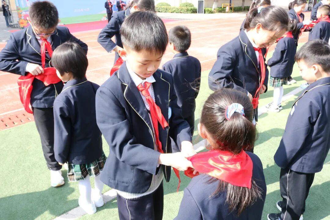 仪式中,潘慧欣老师庄重宣读新队员名单。被点名的新队员们难掩激动,小脸上满是期待,悄悄挺直了腰背。老队员们手持崭新的红领巾,有序上前为新伙伴佩戴——他们仔细地将红领巾披在新队员肩上,动作轻柔却充满力量,仿佛在传递少先队的光荣传统与责任担当。新队员们低头抚摸胸前的红领巾,眼中闪烁着自豪的光芒。