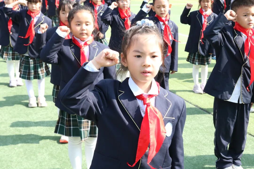 活动在激昂的旋律中拉开序幕。各年级中队长迈着整齐的步伐,向大队长清晰报告人数,稚嫩却坚定的声音,彰显出少先队员严明的组织纪律性。随后,在振奋的《出旗曲》中,两名护旗手伴随执旗手,昂首挺胸走过队伍前方,全体少先队员肃立敬礼,目光紧紧追随队旗,一年级非队员行注目礼,整个操场沉浸在庄重而神圣的氛围中。