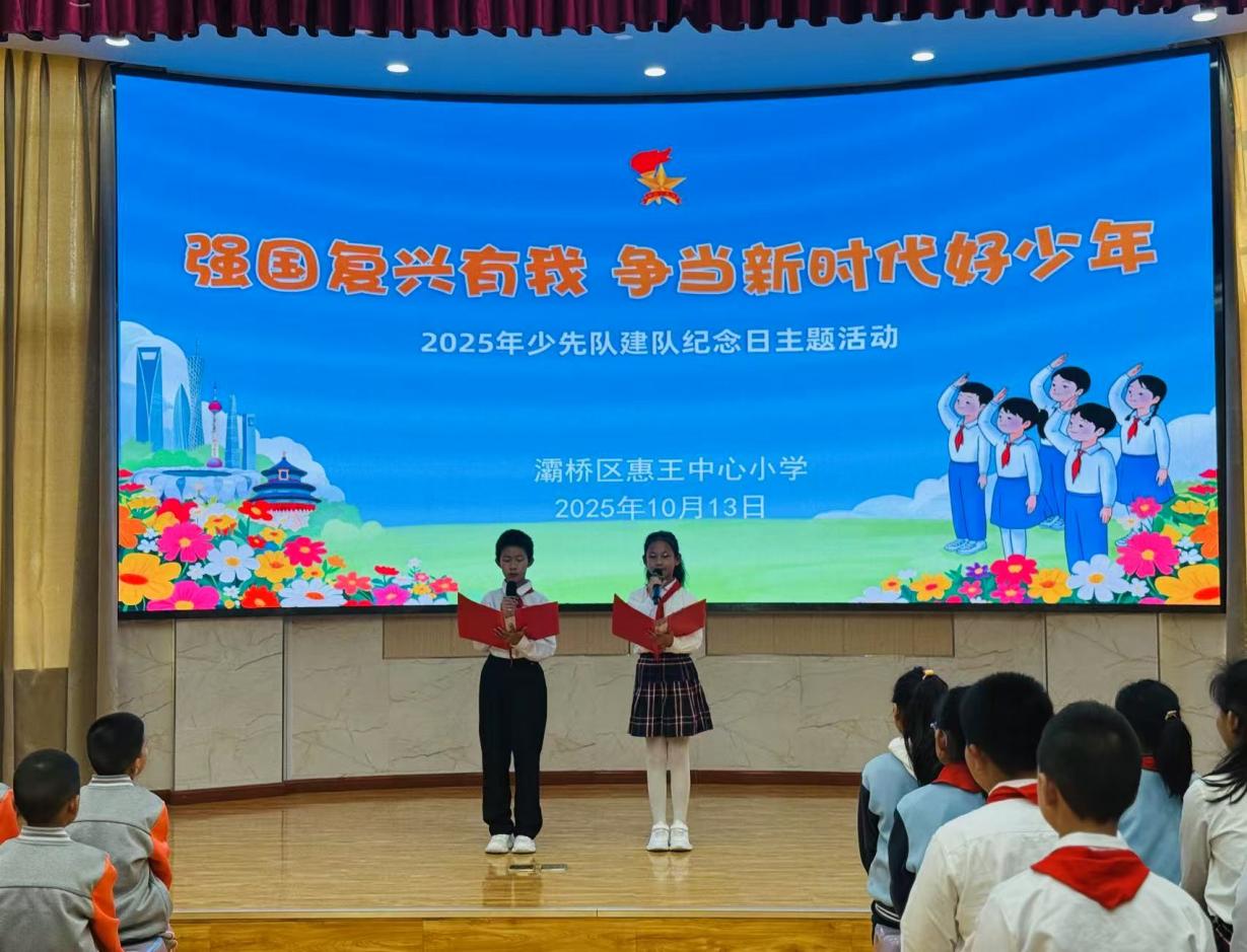 2025年10月13日,以 “强国复兴有我 争当新时代好少年” 为主题的建队日主题活动在西安市灞桥区惠王中心小学展开,该校二年级的同学们迎来了成长路上的重要里程碑,正式加入中国少年先锋队这个光荣的组织。学校也有幸邀请到了灞桥区人民检察院魏颖同志、灞桥区司法局干部梁磊同志、洪庆派出所民警答菲凡同志等参与活动。
