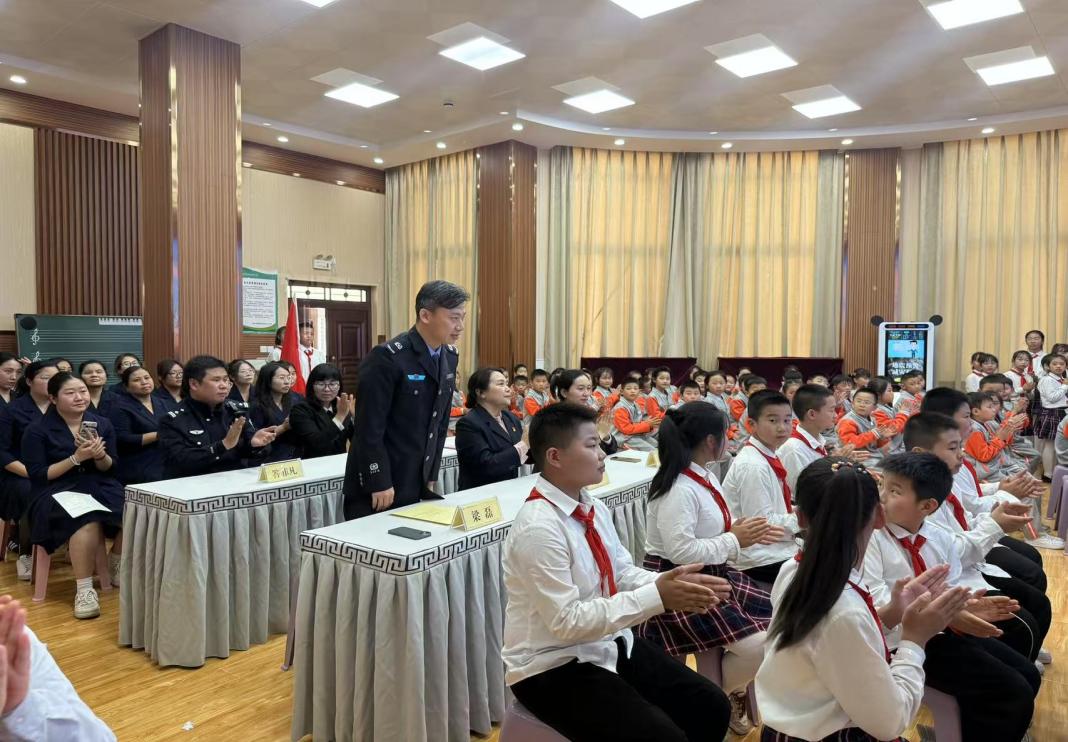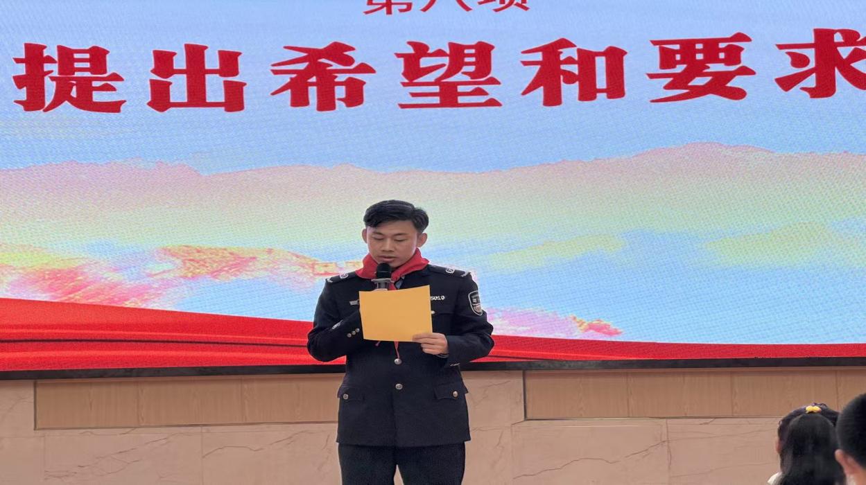 仪式尾声,新聘法治副校长梁校长倾囊相授给孩子们三个法宝,该校少工委副主任为新队员送上寄语,勉励大家以红领巾为荣,时刻以少先队员标准要求自己,在学习中成长、在实践中进步,努力成为有理想、有本领的新时代好少年。