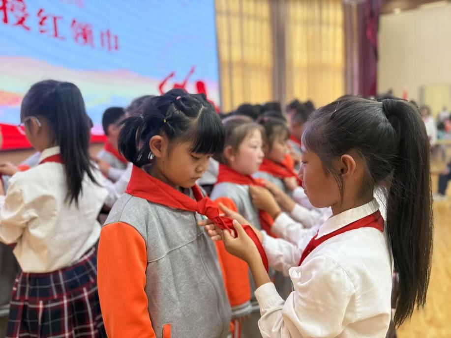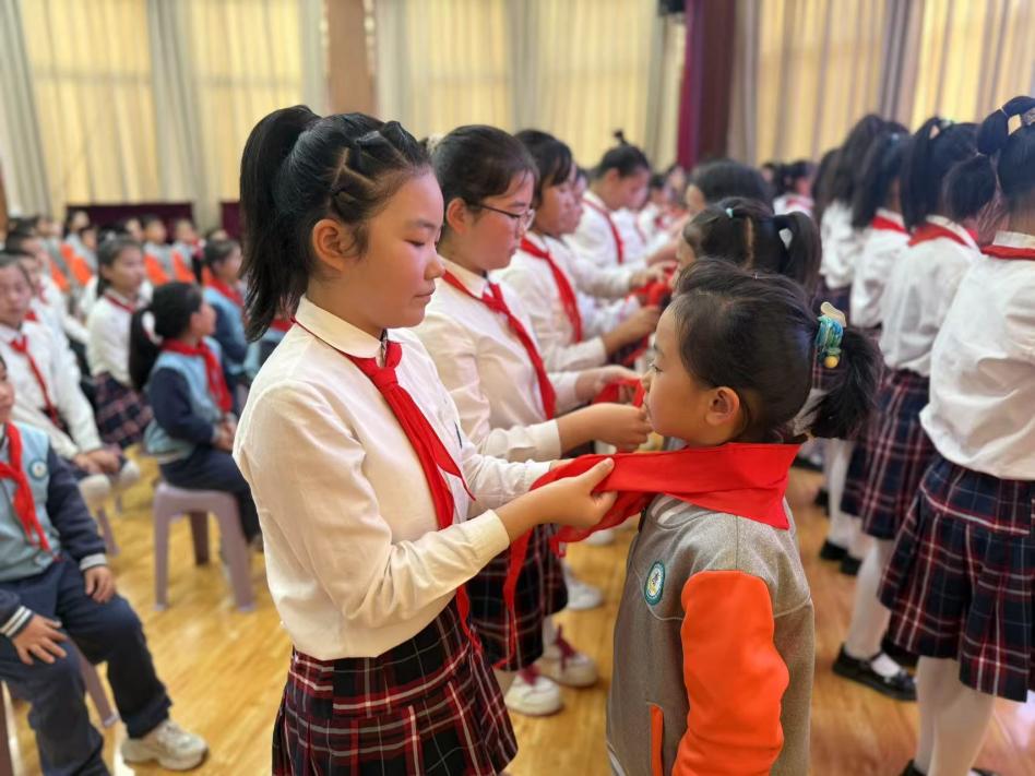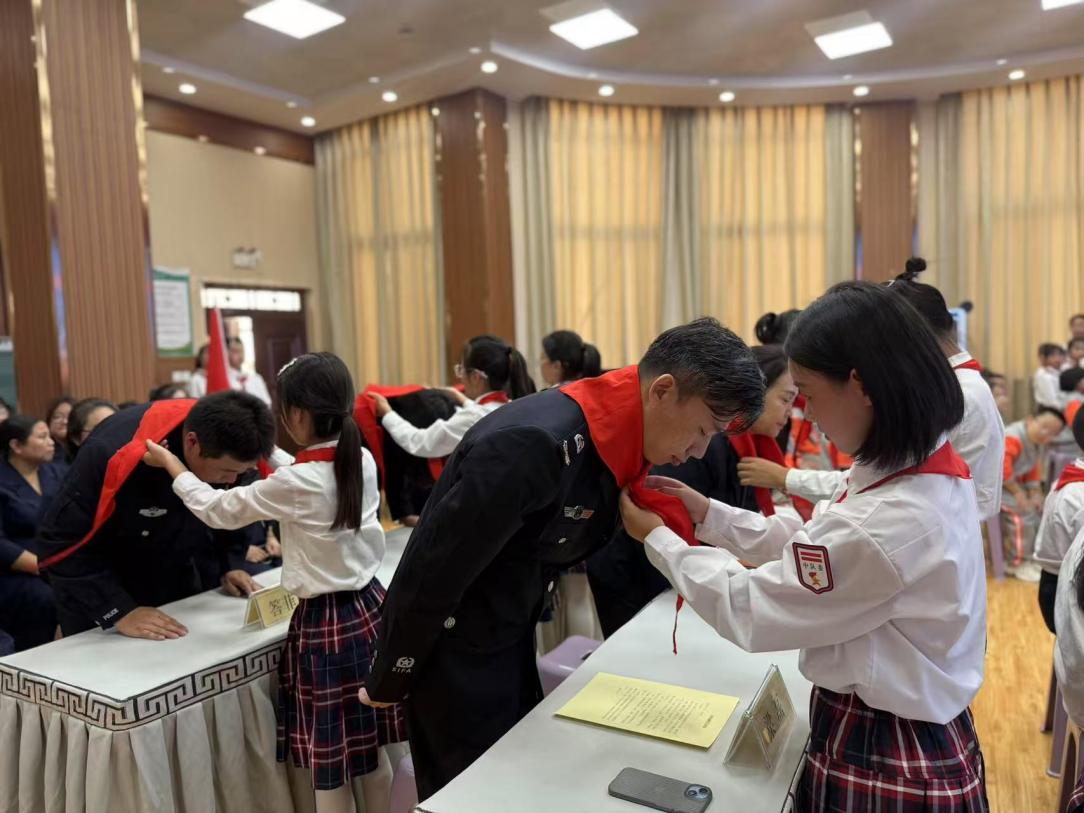高年级队员手捧象征荣誉的红领巾,郑重地为新队员系在胸前,这轻轻一系,不仅系上了红旗的一角,更传递了革命先辈用鲜血铸就的精神火种。