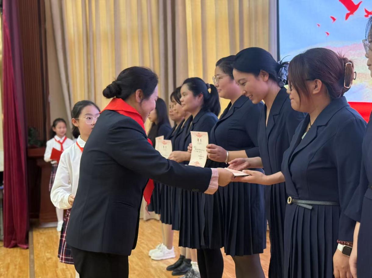 中队建设也需要新鲜血液的注入,学校少工委主任为新聘中队辅导员颁发聘书。