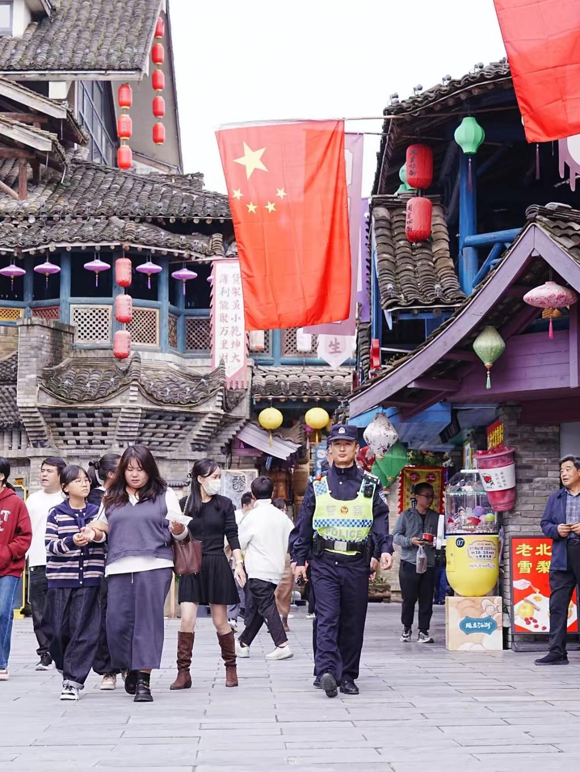 红旗漫卷映长安,国庆中秋假期的西安被一抹抹绚丽的“中国红”所包裹,从永宁门到钟鼓楼广场、从大雁塔到大唐不夜城,处处洋溢着节日的喜庆与祥和。在这份热闹的“中国红”里,有许多“藏蓝”的身影始终坚守,他们以贯穿昼夜的巡防编织着古都的平安经纬,以倾尽全力的行动兑现了家国团圆的诺言。