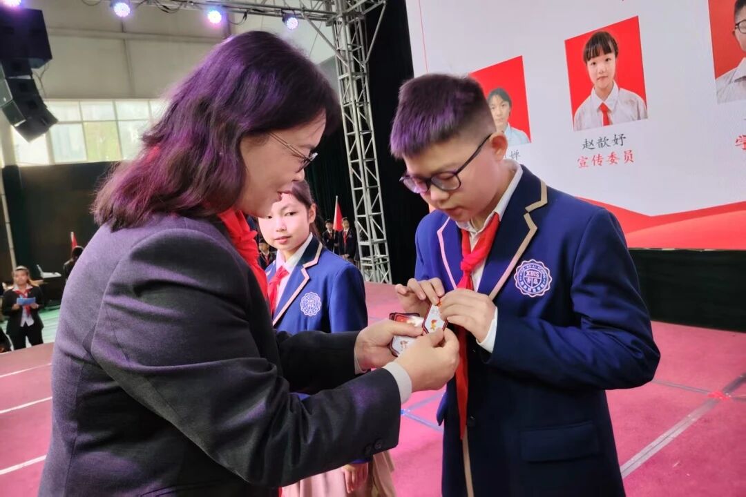 在聘任授牌环节,王丽娟总校长为各中队辅导员颁发了聘书,这不仅是对老师们辛勤付出的肯定,更是一份沉甸甸的责任与信任。随后,小学部刘蓉侠副校长宣读了经过严格选拔的新一届大队委名单。王顺喜书记、王丽娟校长、小学部杨晓校长共同为大队委们授予了标志。新任大队委们在铿锵的宣誓中,许下了服务同学、奉献集体的庄严承诺。
