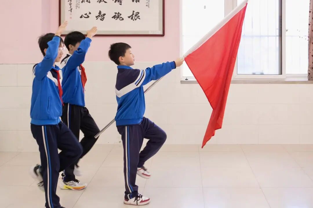 与朝阳同升的,不仅有庄严的五星红旗,更有缀有星星火炬的少先队队旗。在全体队员的注目下,少先队队旗由护旗手整齐护送、缓缓展开,既映照出全体队员专注肃穆的眼眸,也点燃了大家心中赓续红色血脉、勇担时代使命的信仰星火。