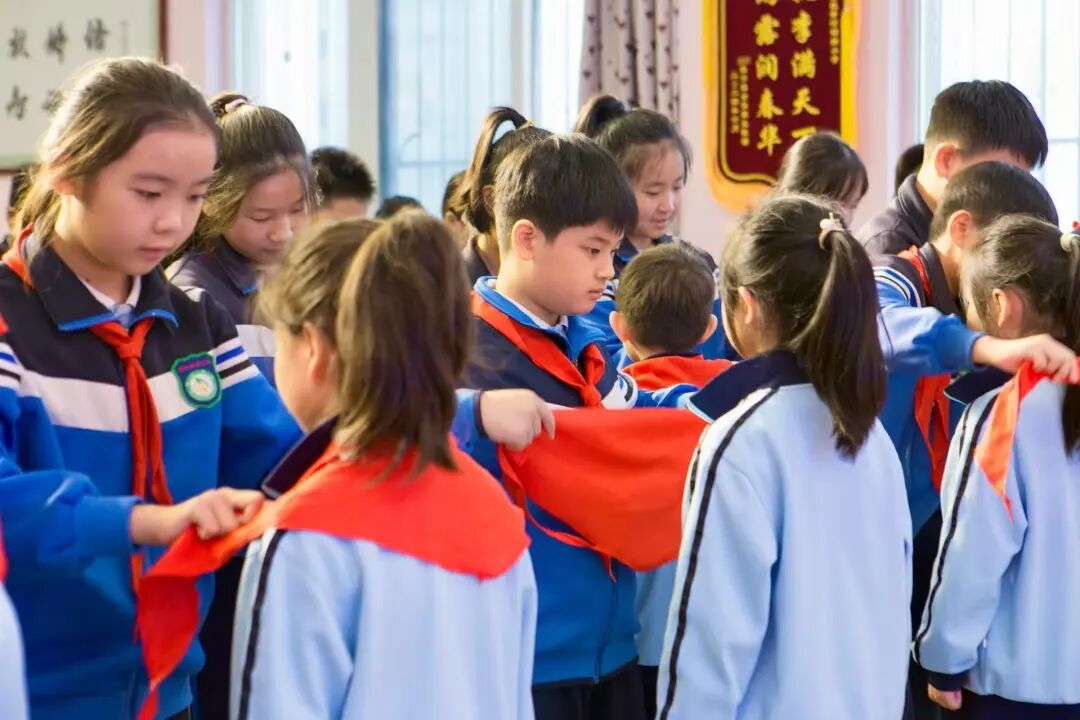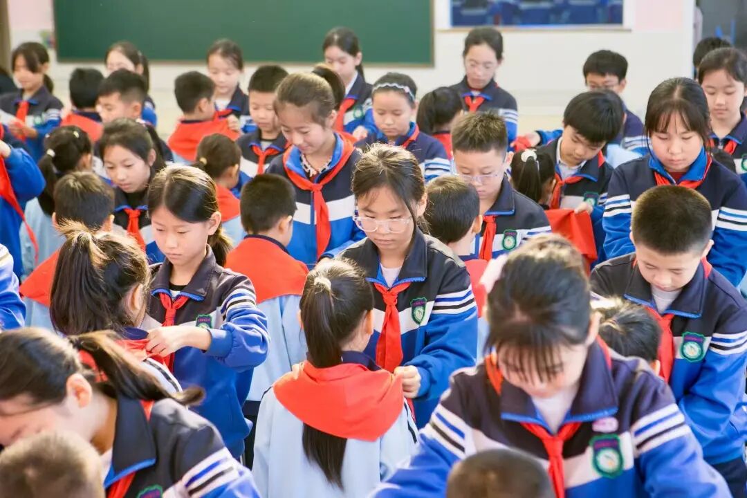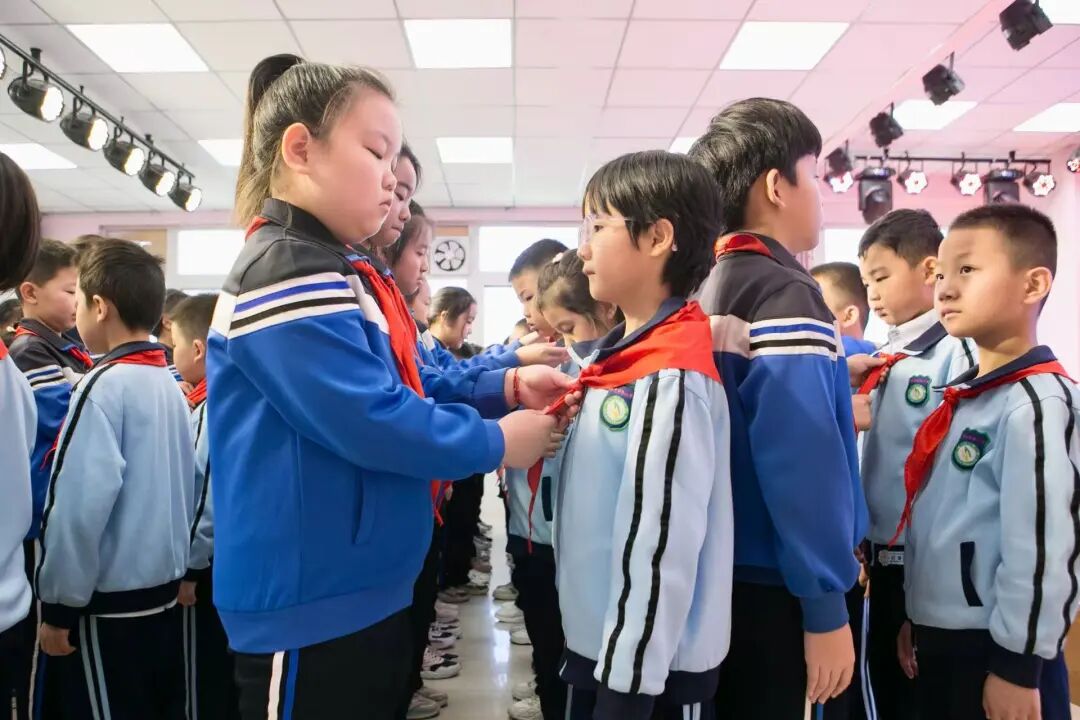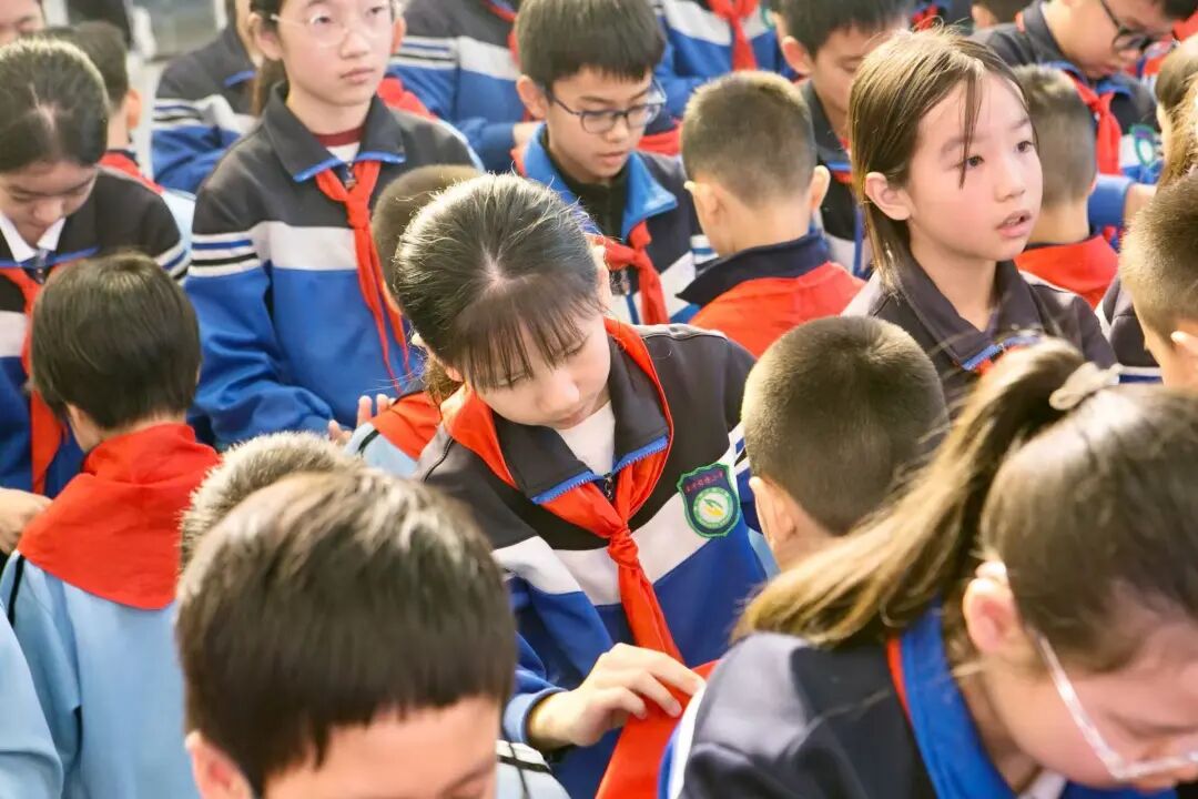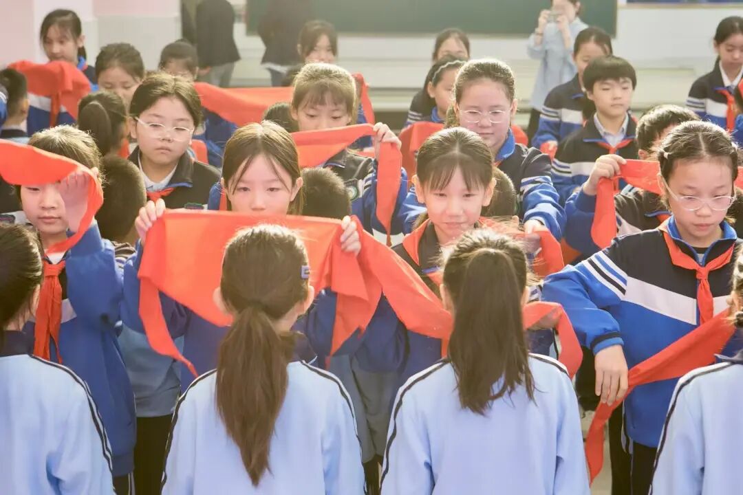 二年级同学身着整洁校服,眼神中饱含对加入少先队的热切期待与向往。灞桥区黄河锦绣小学大队辅导员助理焦腾菲老师依据程序宣读新队员名单,每一个名字背后,既承载着学校对少年成长的殷切期望,更凝聚着少先队组织对新生力量的期许。随后,高年级少先队员代表为新队员郑重系上鲜艳的红领巾,鲜红的领巾从指尖延展至胸前,不仅是身份的象征,更在新队员心中深深播下了“爱党爱国、担当使命”的责任种子。