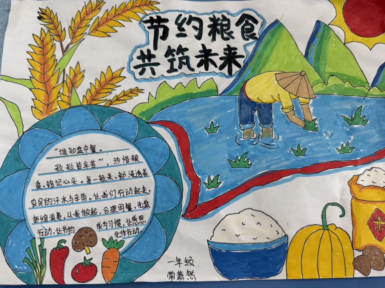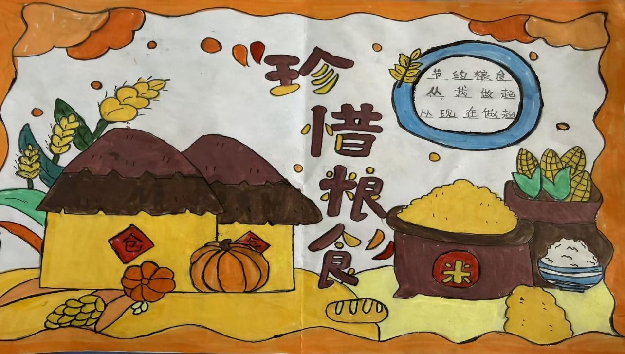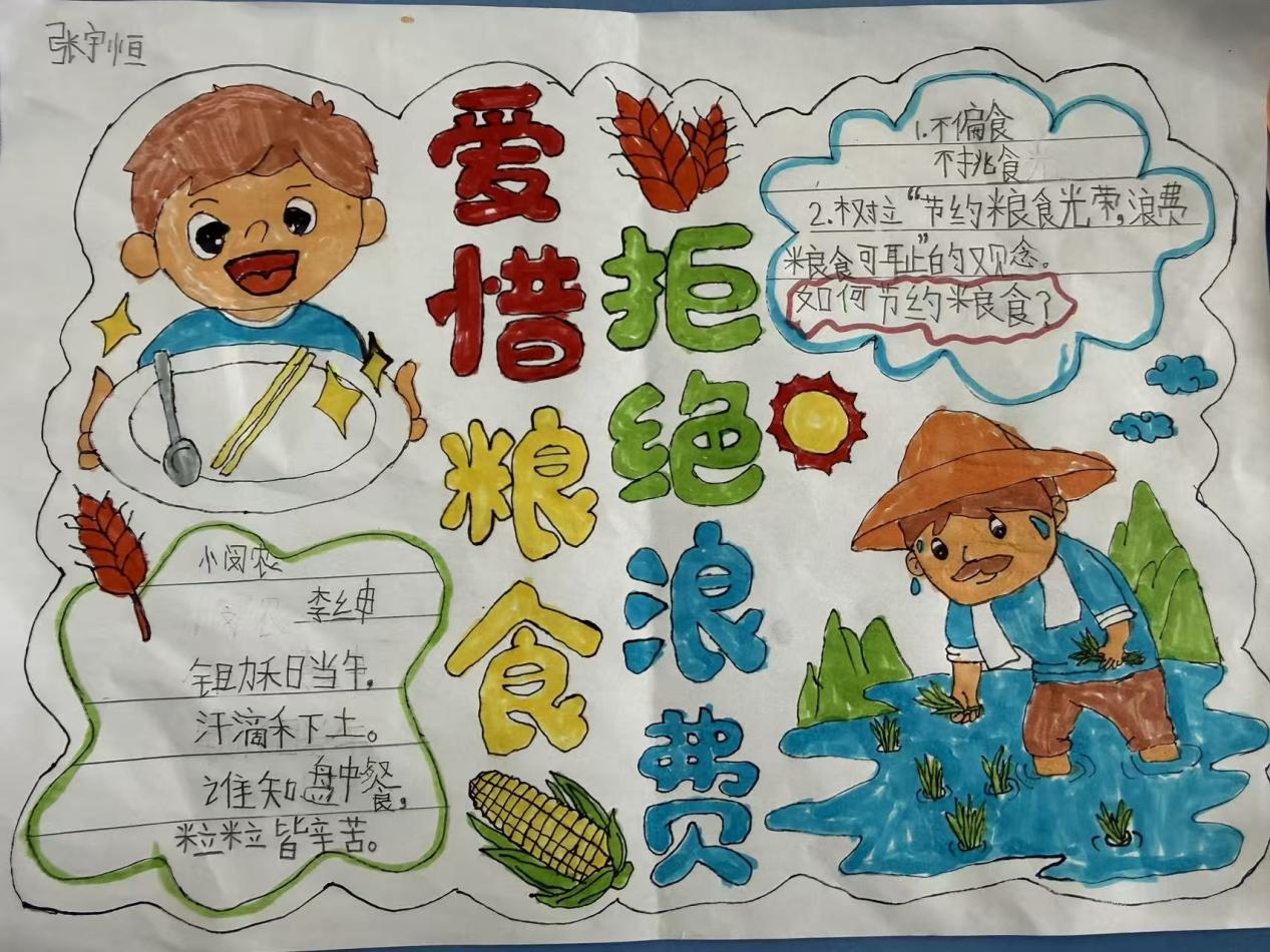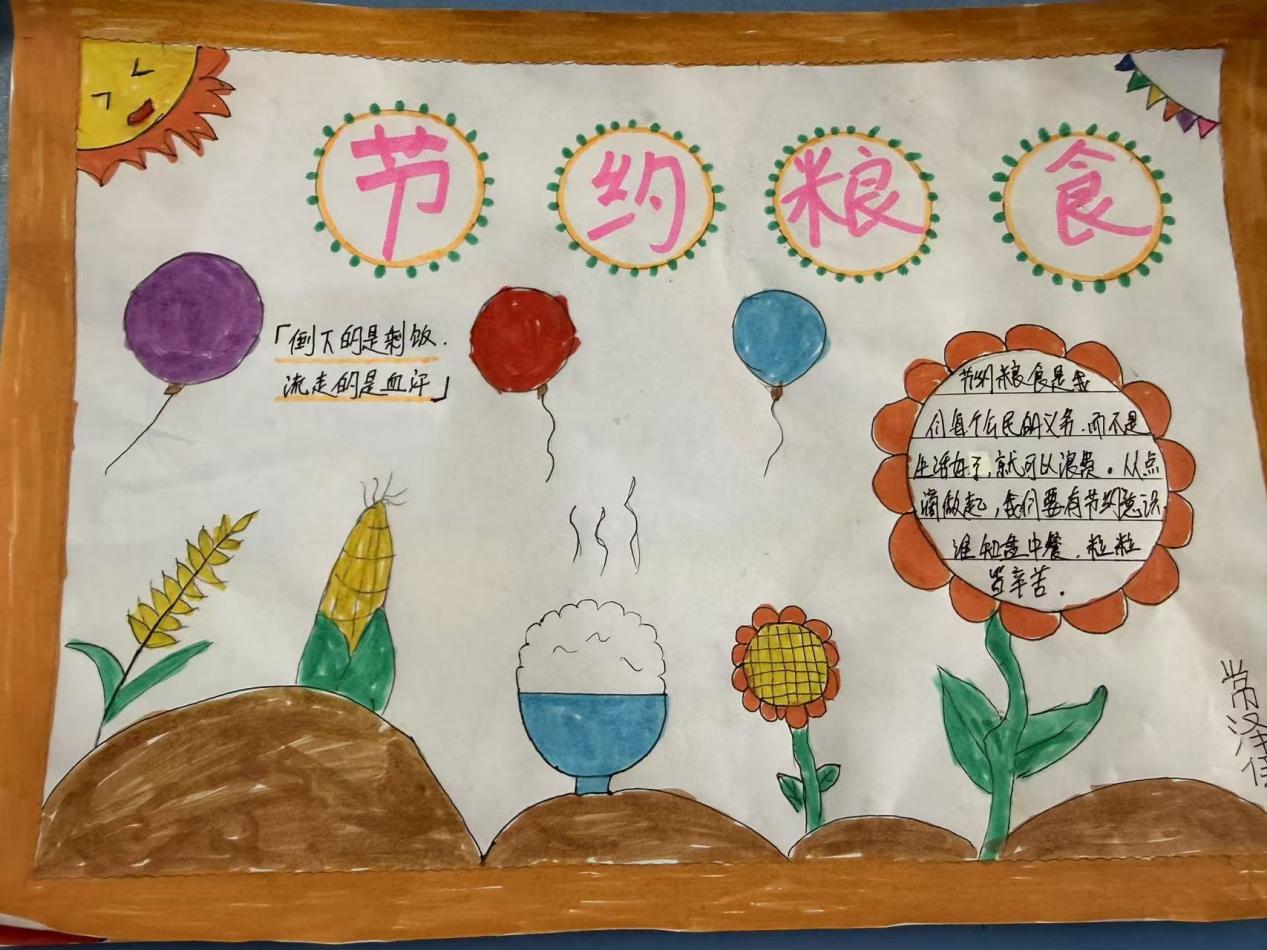 同学们利用课间时间制作主题手抄报,践行节约粮食的理念。