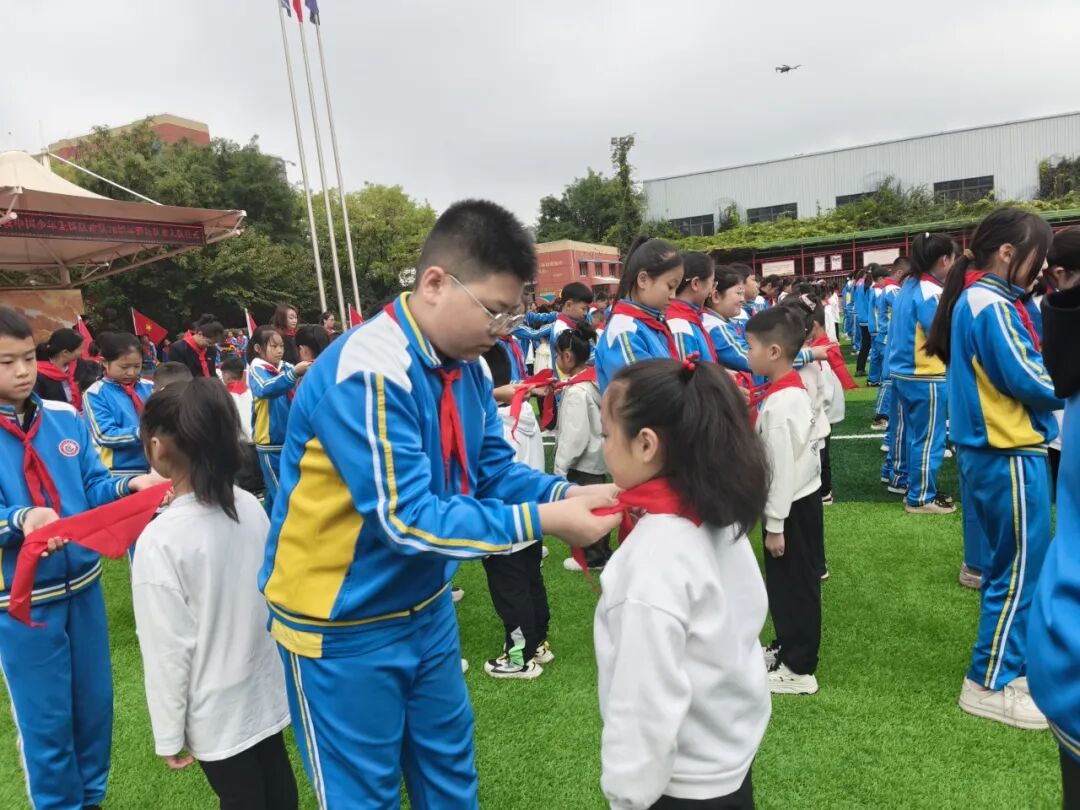 在期待的目光中,大队委员会宣读了新队员名单。最激动人心的授巾环节到来——六年级的优秀少先队员代表、中队辅导员代表们和校领导们郑重为新队员佩戴鲜艳的红领巾。这抹由革命先辈鲜血染红的颜色,既是荣耀,更是责任。新老队员互敬队礼,红色基因在无声中完成交接,光荣与梦想在此刻启航。
