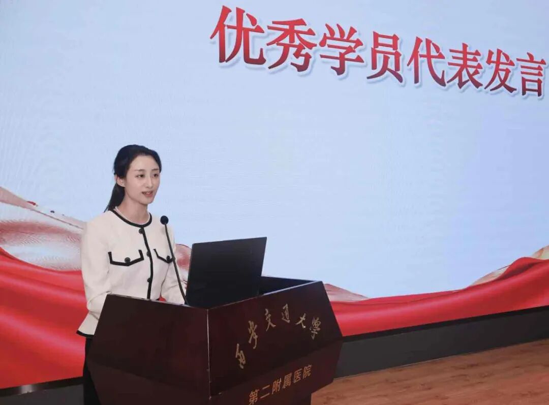 在结业典礼上,马绮作为 “优秀学员” 代表上台发言,分享了自己在安宁疗护领域的学习心得与实践感悟。她结合临床案例,阐述了 “以患者为中心” 的安宁疗护理念,其沉稳的表达与深刻的见解,充分展现了西安市第九医院护理人员的良好精神风貌,赢得了在场专家与学员的一致认可。