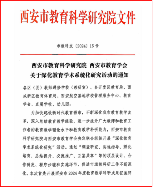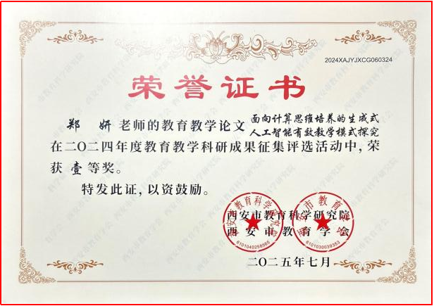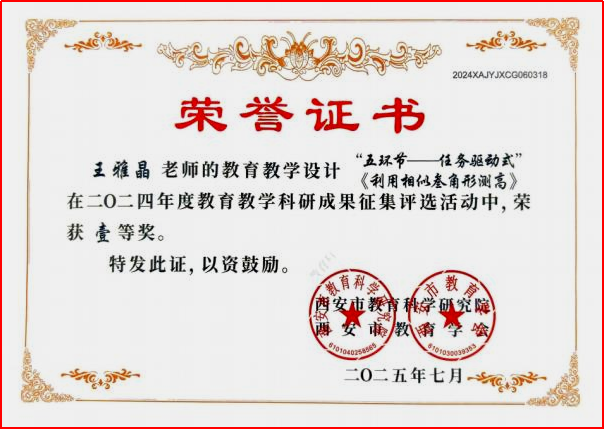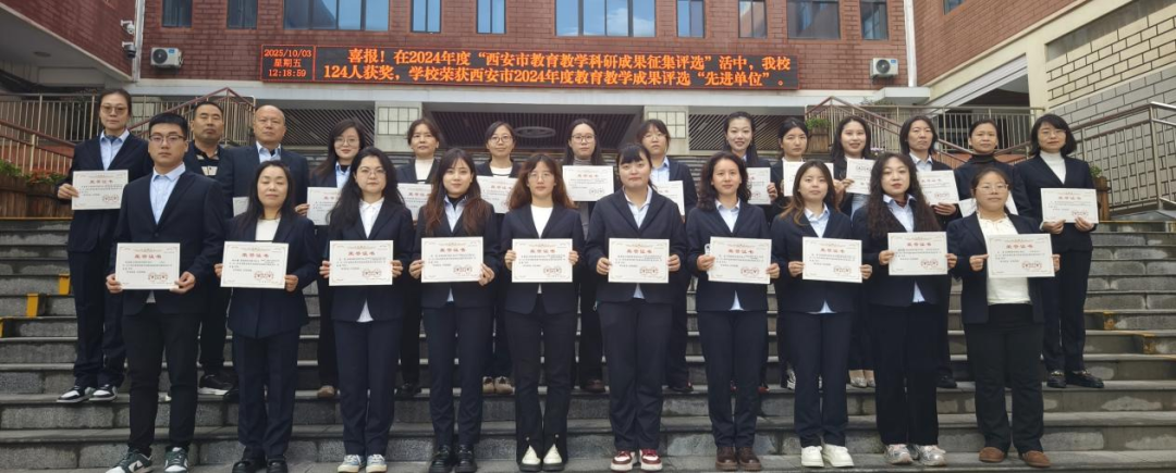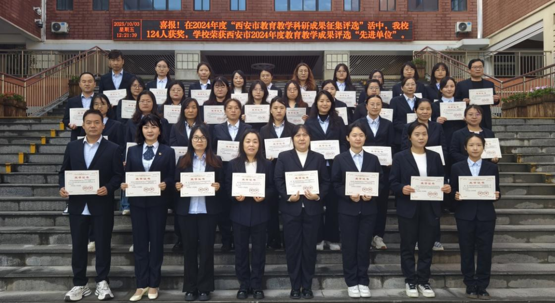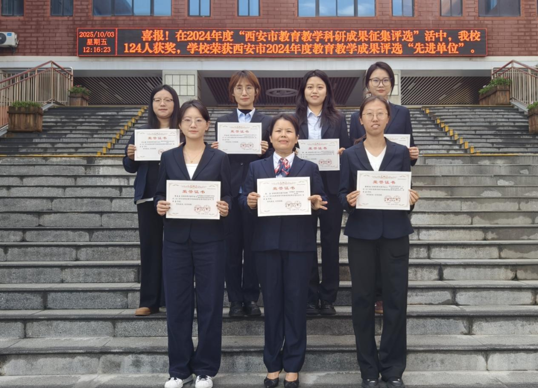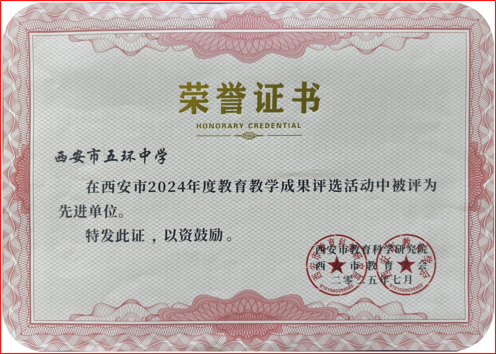 在2024年度西安市教育教学科研成果征集评选活动中,该校教师踊跃参加,其中一等奖10人,二等奖30人,三等奖60人,优秀奖24人,共计124人,五环中学荣获“西安市2024年度教育教学成果评选先进单位”荣誉。这一骄人成绩正是学校“科研兴教·强师兴校”的重要成果。
