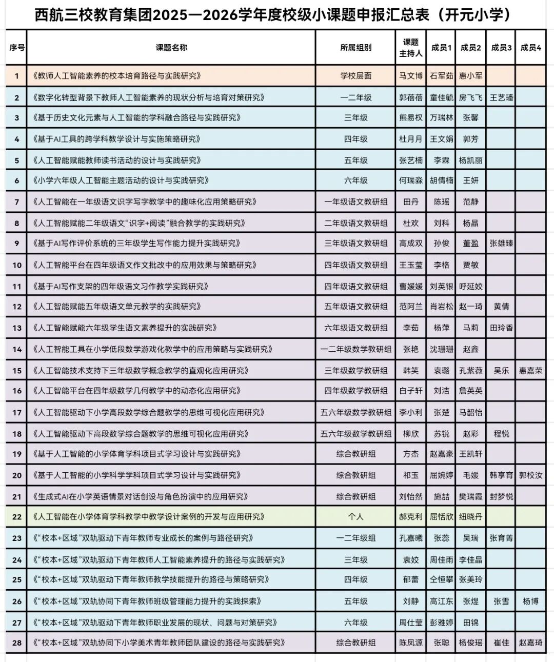 为深入落实《未央区教育局教研室2025-2026学年度校本研修工作实施方案》与《未央区推进中小学人工智能教育实施方案》的要求,10月9日至11日,西安市未央区开元小学举行了2025——2026学年度校级课题开题论证会。经个人自主申报与学校统筹安排,共有28项校级课题成功立项,其中,20项聚焦“人工智能”领域,8项围绕“青年教师成长”主题,为学校教育科研高质量发展注入强劲动力。
