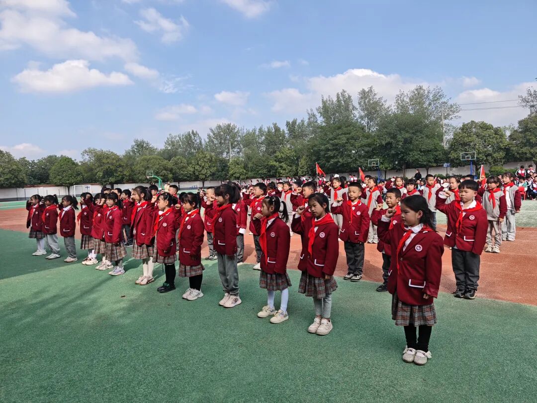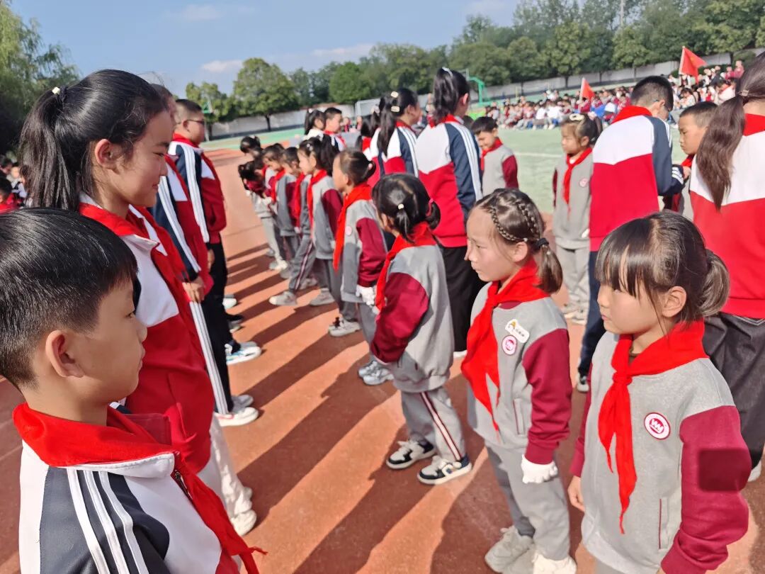 大队辅导员魏老师宣读新队员名单时,二年级的新队员们满怀激动地走上跑道,迎接属于他们的“红色荣光”。在《红领巾飘起来》的悠扬旋律中,老队员为新队员佩戴红领巾,一次队礼的互敬,是信仰的传递,更是“薪火相传”的生动注脚。