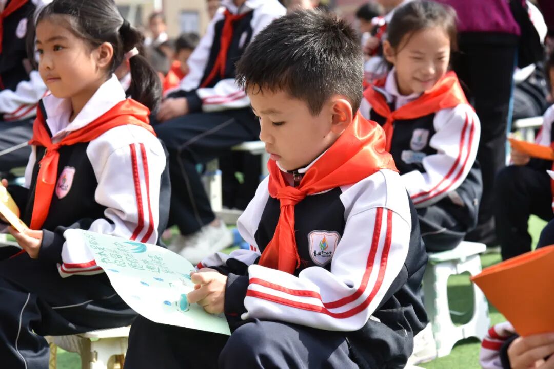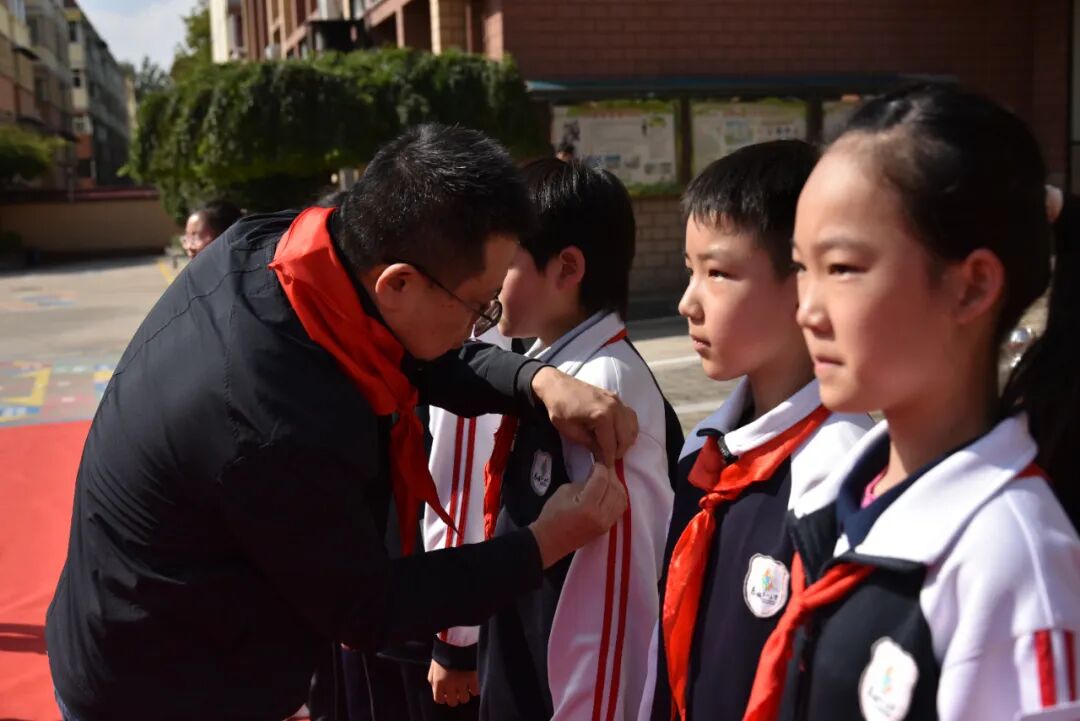 追寻红领巾的足迹,汇聚成复兴路上的磅礴力量。耕耘脊梁、奉献微光,一代代少年用行动诠释着担当。王小玉书记和郑多副校长为新一届大队委授予标志,在大队长陈金怡的带领下郑重宣誓:热心为集体,责任我担当。从小学先锋,长大做先锋,争做新时代好少年!