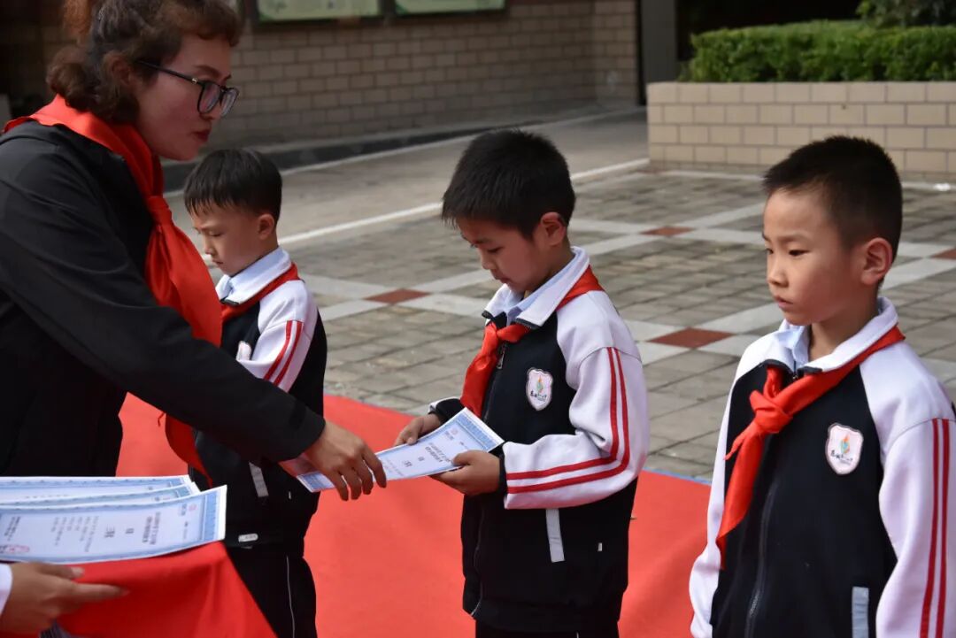 二年级的一群小伙伴将光荣加入少先队大家庭,六年级少先队员代表为新队员佩戴红领巾,在大队辅导员的带领下庄严宣誓。欢迎你们,新伙伴!戴上红领巾,你们就多了一份责任;加入少先队,你们便踏上了追梦的征程。