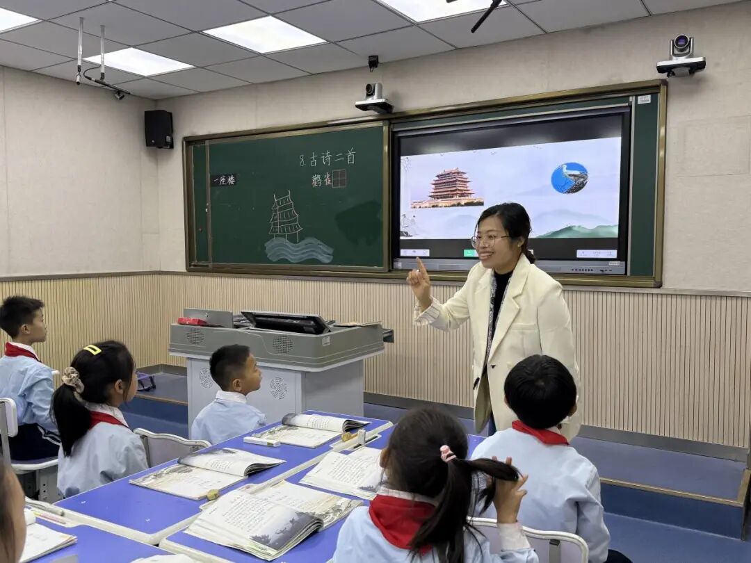石朝艳老师首先分享《登鹳雀楼》的设计思路,她坦言:“低段古诗教学要在‘有趣’与‘有效’间找平衡,既要让孩子喜欢读,又要让他们读懂诗中的情与理,这节课的‘关键字咀嚼’和‘生活联想’是我尝试的突破点。”