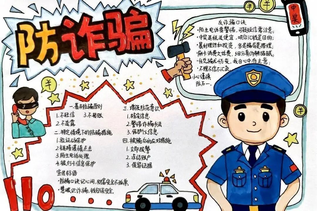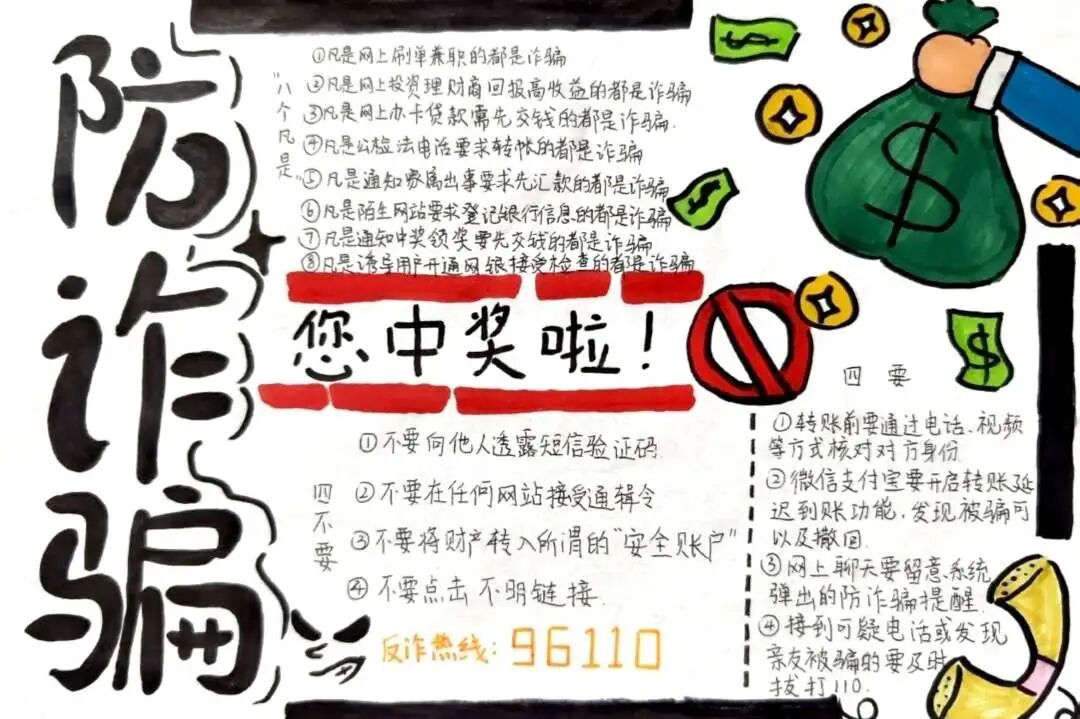 同学们还绘制了一张张设计精美、内容充实的手抄报,犹如一个个会说话的反诈宣传栏。同学们巧妙地将“96110反诈专线”和“国家反诈中心APP”等核心知识融入其中,形成了浓厚的反诈氛围。