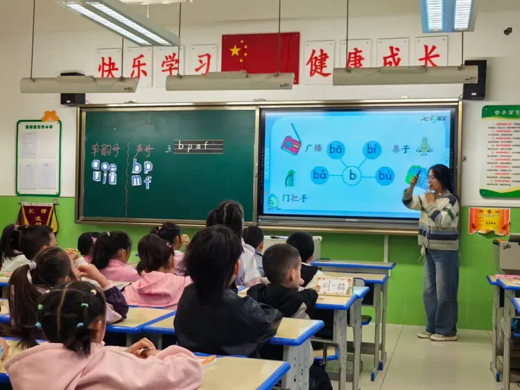 姜静老师以一年级拼音教学《b p m f》为课题,打破传统拼音教学的机械记忆模式,将费曼教学法 “具象化表达” 的精髓融入课堂。姜老师通过 “拼音手势操” 创设情境,让学生用手比出 “b” 的半圆弧度、“p” 的竖线形态,再以 “小老师领读” 的形式,鼓励学生用自己的语言讲解拼音发音要领,原本抽象的字母符号在互动中变得直观易懂。