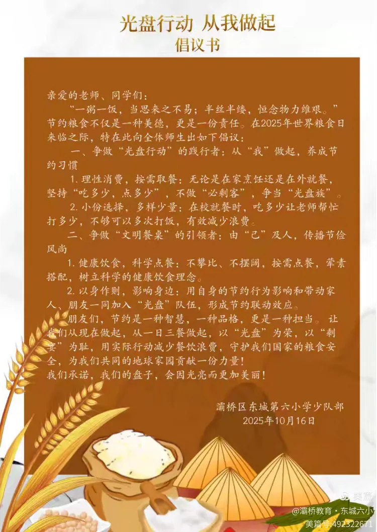 金秋十月,稻谷飘香。10月16日是一年一度的“世界粮食日”,为了让每一位学生都懂得“一粥一饭,当思来之不易”的道理,西安市灞桥区东城第六小学开展了系列主题教育活动,将“爱粮节粮”的种子,深深植根于孩子们的心田。