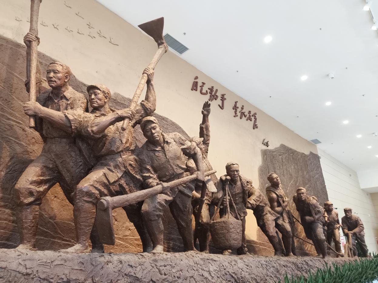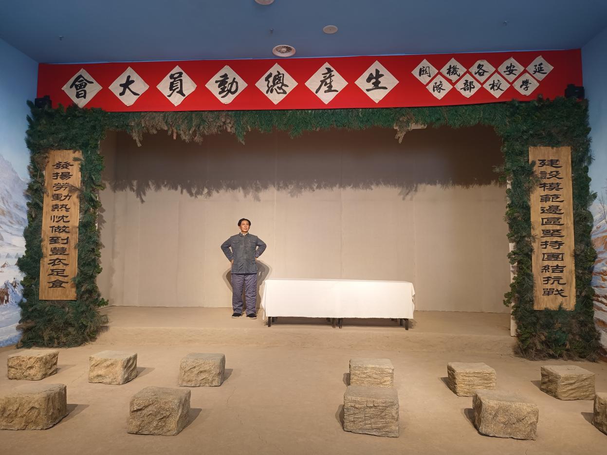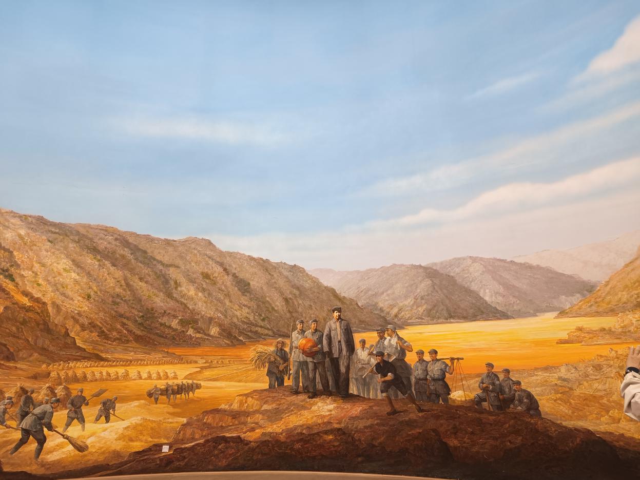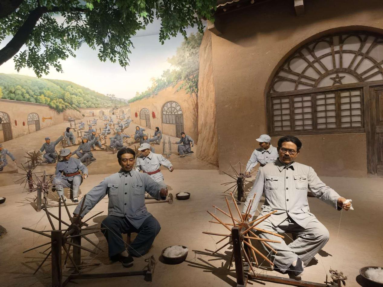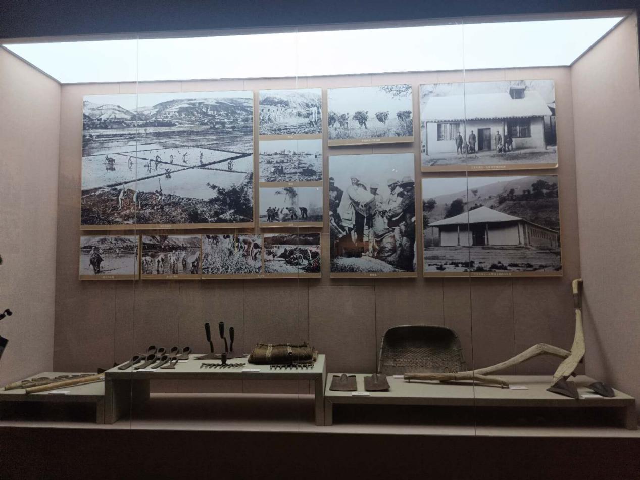 记者团走进南泥湾大生产展览馆内,记者们跟随讲解员的步伐,在一幅幅珍贵的历史照片、一件件斑驳的农耕器具前驻足凝视。展览馆全方位、沉浸式地再现了上世纪四十年代那场轰轰烈烈的大生产运动。