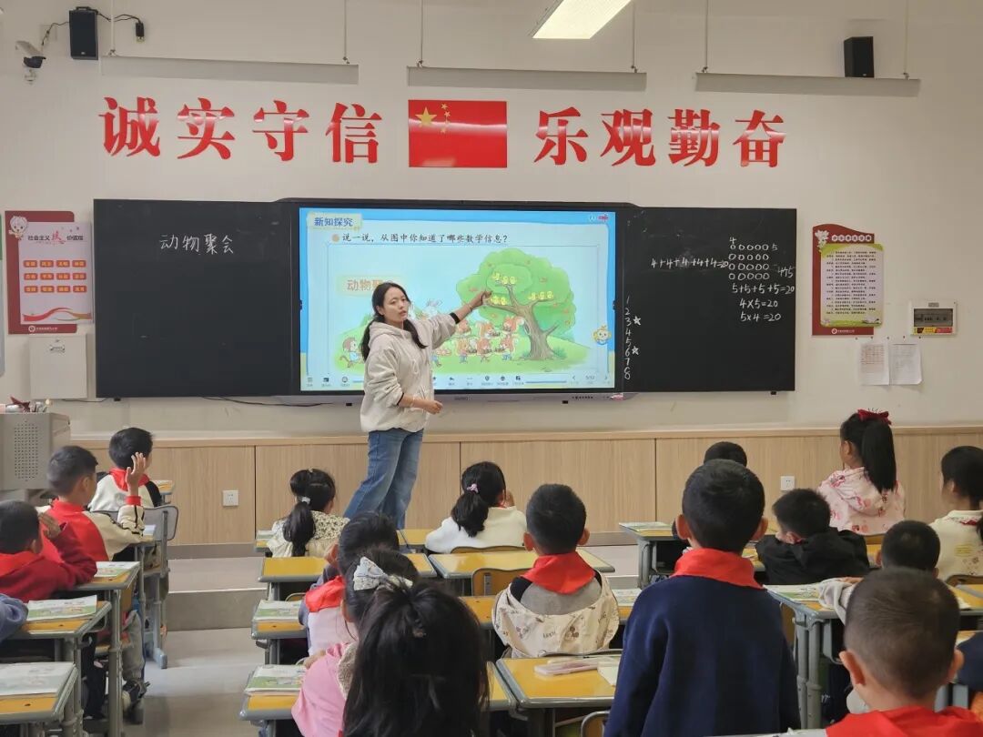 刘怡爽老师讲授《动物聚会》一课,刘老师首先以“动物聚会”情境为切入点,引导学生观察图中数学信息,初步感知乘法的现实意义。通过连一连,看图列算式等环节,帮助学生理解乘法是相同加数加法的简便运算,同时区分“几个几”的不同表述。