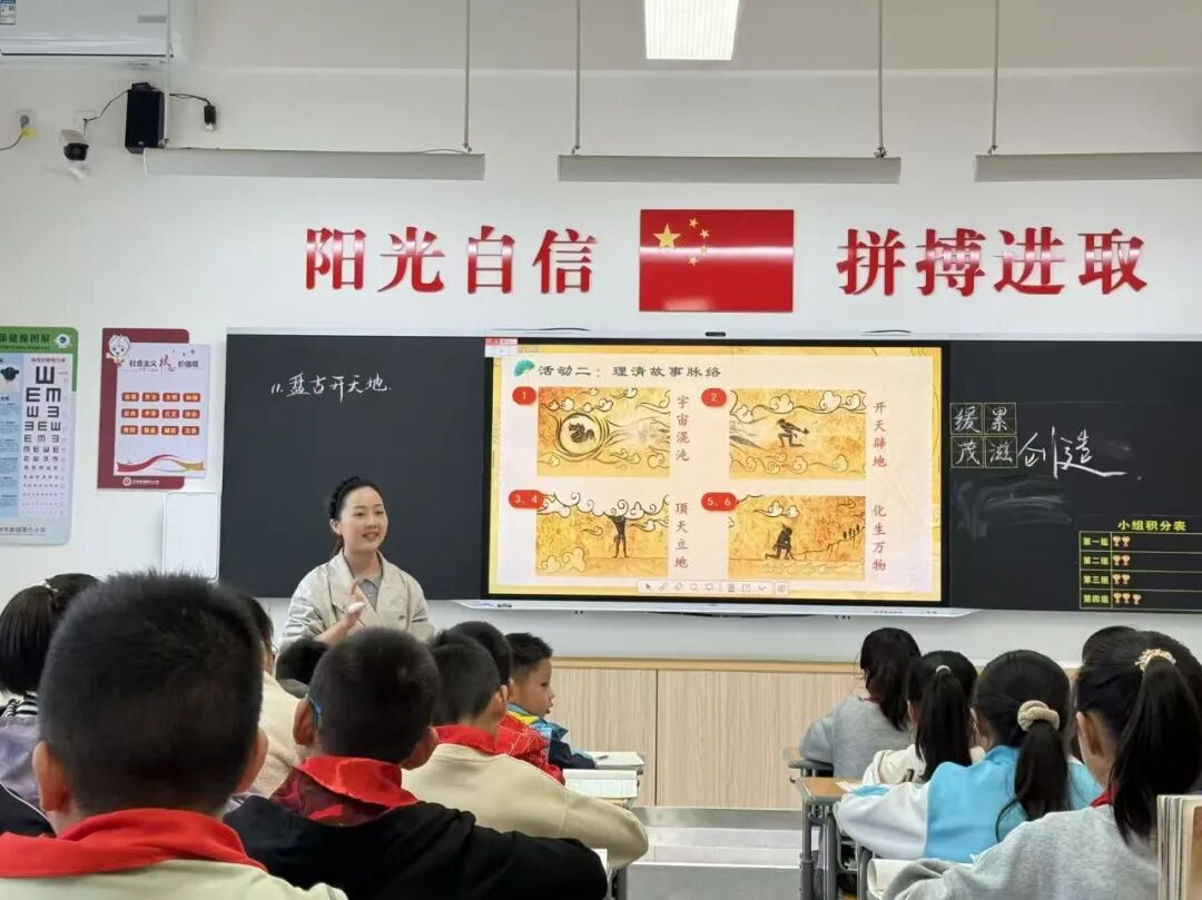袁老师教授的是《盘古开天地》第二课时,她带领学生寻找神话文本中的“神奇”之处,理清故事情节、发现盘古的人物精神。重点诵读文章第5段,以配乐朗读、师生共读等多种形式感悟盘古化生万物的伟大奉献精神,以续写的形式培养学生的语言运用能力。