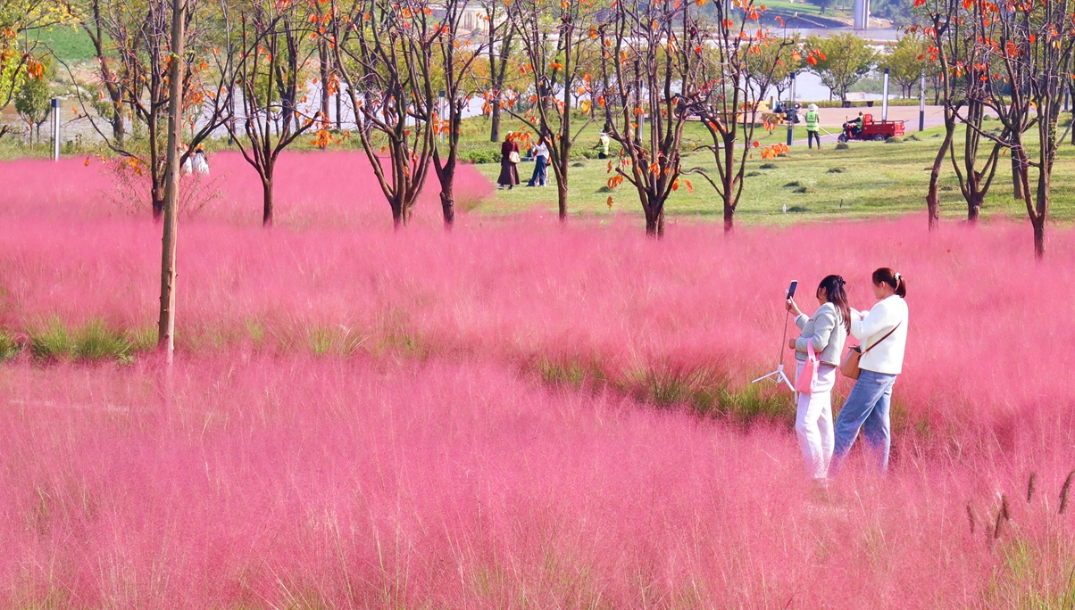 不少摄影爱好者会特意选在傍晚时分前来,此时夕阳的橙红光芒洒在粉黛上,让粉色多了一层暖调,拍出来的照片更显浪漫。除了拍照,游客也能在周边的运动场地体验骑行、慢跑等项目,待累了便坐在花海旁的长椅上,看着往来的人群与粉色花浪,让秋日的闲暇时光满是温柔与诗意。