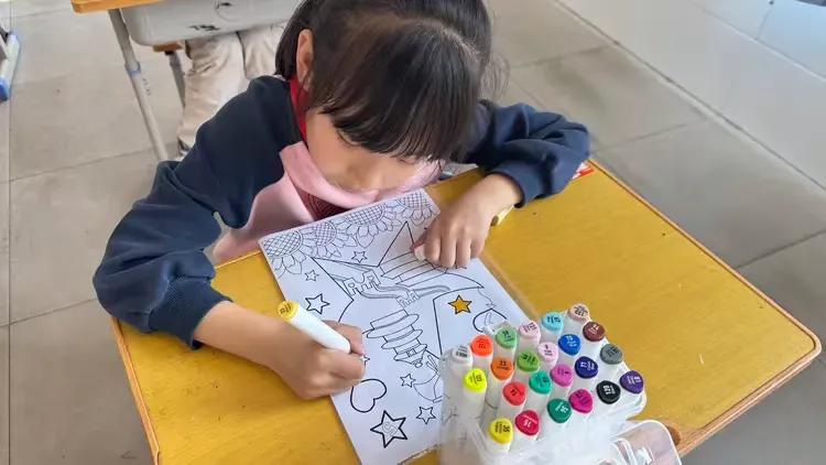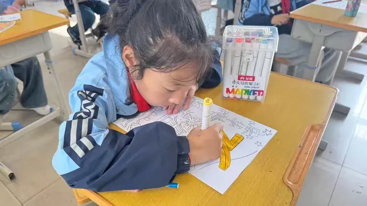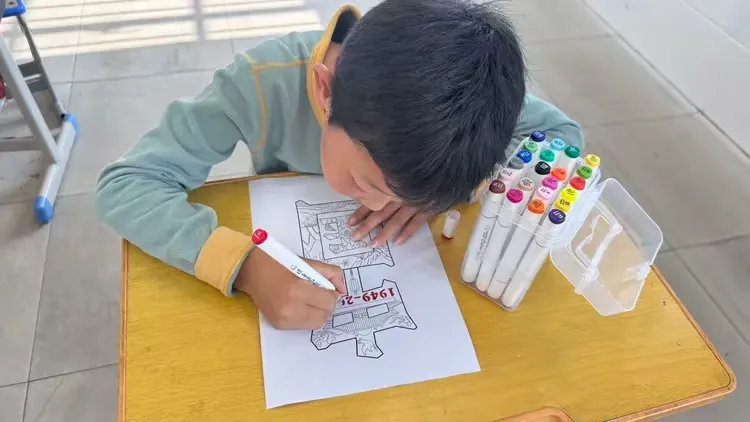 教室里,孩子们全身心投入到绘画之中,有的低头构思画面,有的已经开始勾勒轮廓,有的用马克笔细致描绘天安门,有的专注涂色,让画面中的国旗更加鲜艳。
