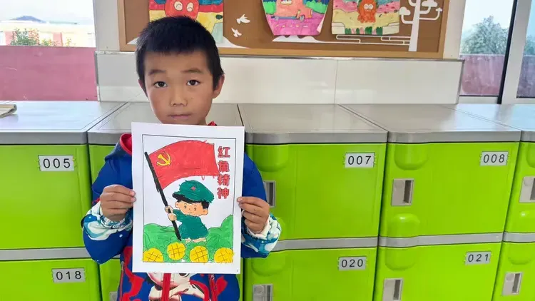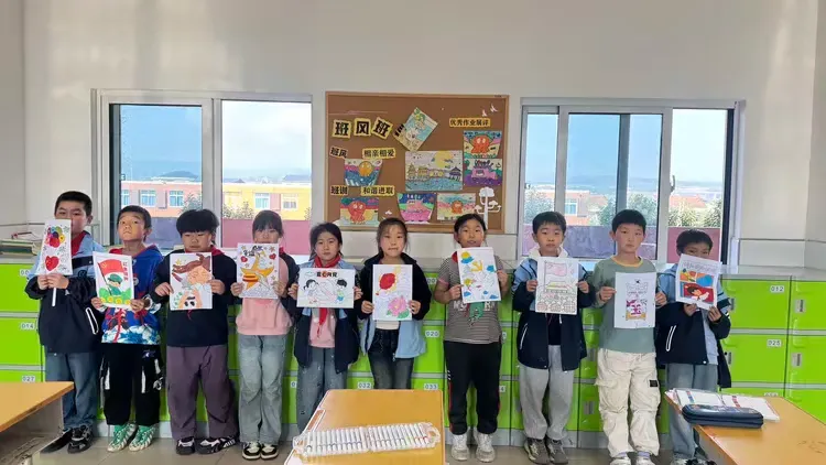 孩子们兴奋地展示自己的作品。有的举着画有国旗的画作,有的向同学介绍画面中的天安门和华表......每一幅作品都充满童真与创意。