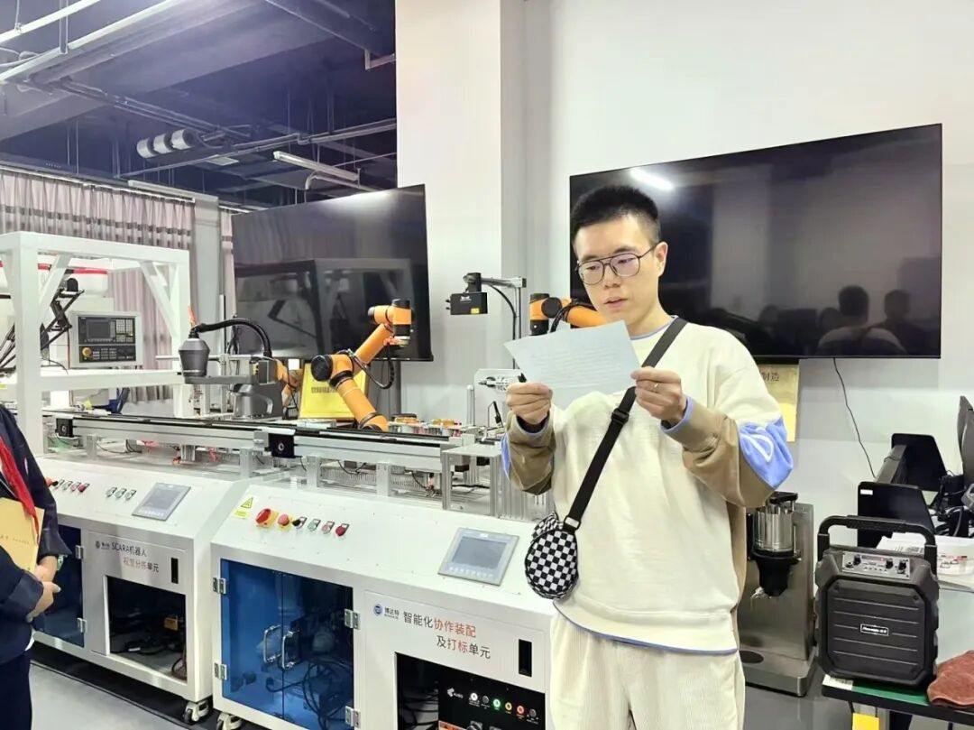 “这条生产线就像一个机器人大家庭”,陕科大刘老师生动地讲解道,它们分工明确:有的负责抓取零件,有的负责加工制作,还有的负责组装成型。同学们围在生产线旁,入神地看着机器人用“眼睛”识别零件,灵巧地完成抓取、加工、传递的整套动作,整个过程流畅得就像在跳一支精准的舞蹈。