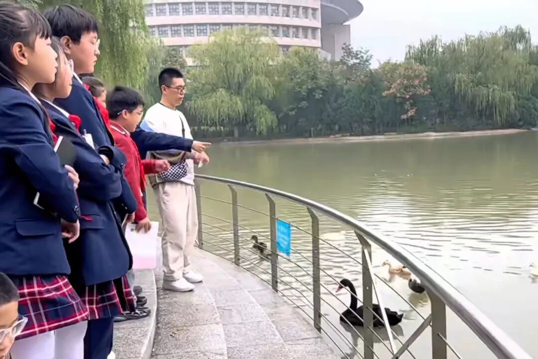 离开实验室后,在该校科技副校长孙梓雄教授的带领下,同学们漫步在秋意渐浓的陕西科技大学校园里。道路两旁绿树成荫,现代化的教学楼与书香浓郁的图书馆相继映入眼帘,每一处景致都吸引着孩子们好奇的目光。大家还特别前往观赏了优雅的黑天鹅,为这次校园之旅增添了别样的趣味。