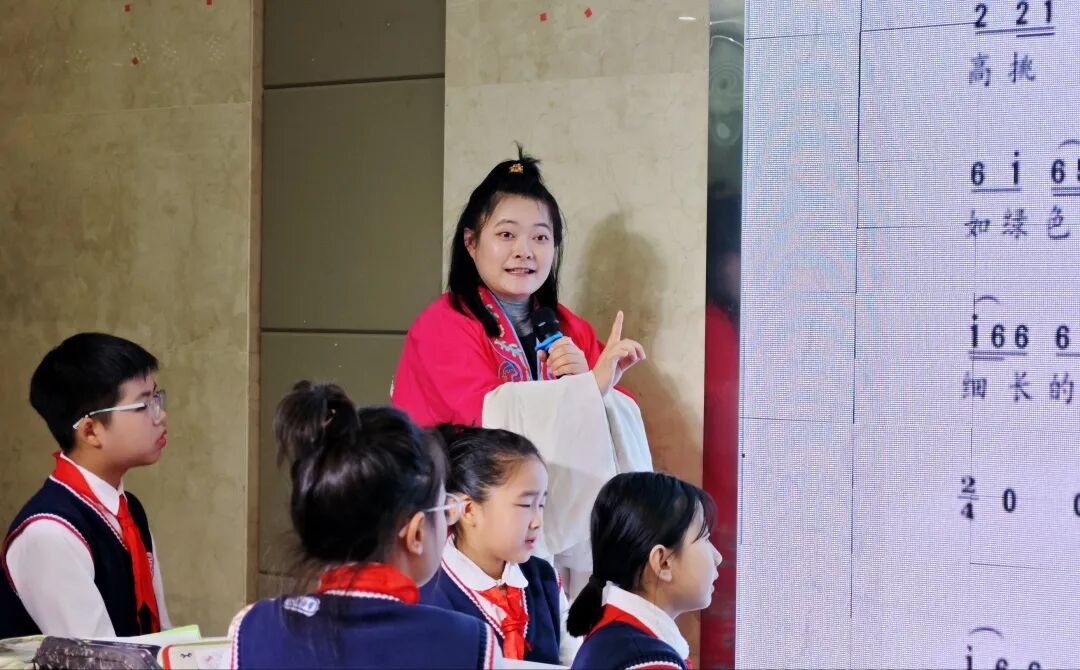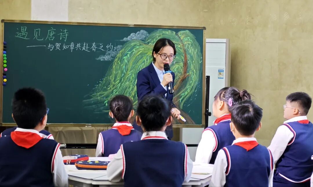 该校语文教师王睿与音乐教师奚萌联袂执教的《遇见唐诗——与贺知章共赴春之约》,打破学科壁垒,以“诗乐画相融”为主题,引导学生在古诗词中感受韵律之美,在旋律中体悟文字意境。课堂上,学生通过朗诵、吟唱、戏曲、绘画等多元形式,展现了综合素养的提升,为观摩教师提供了跨学科教学的鲜活范本。