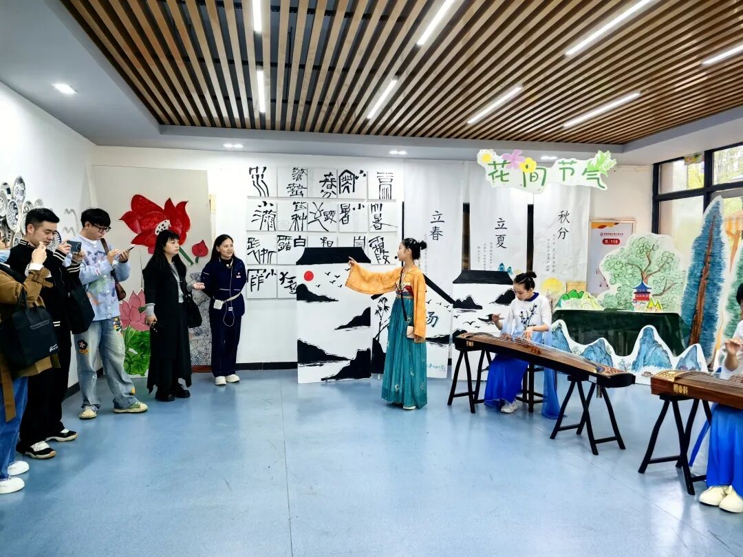 嘉宾们在学校宣传负责人李婧老师的引领下漫步校园,依次打卡图书馆的“吟诵新唱”、舞蹈教室的社团排练、美术教室的创意工坊、书法教室的墨香雅韵、音乐教室的天籁之音以及《叮咚剧场》的古筝合奏等特色空间,沉浸式感受学校“处处是课堂,时时有美育”的独特诗意校园文化。